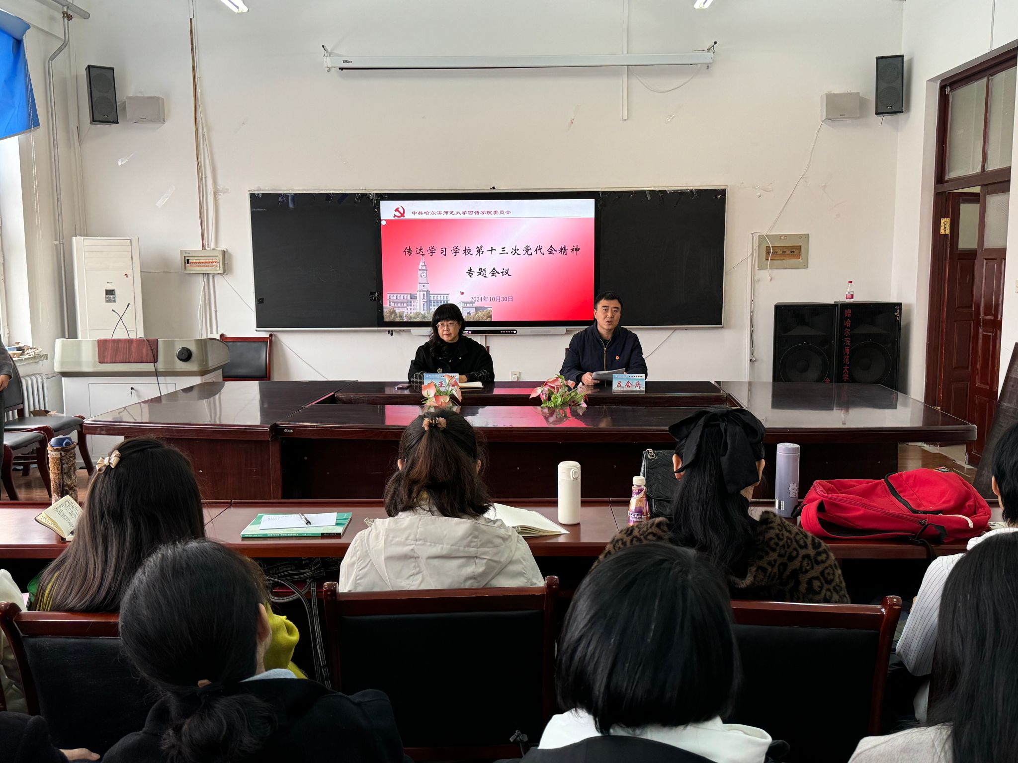 10月30日上午,西语学院在西语楼527室召开传达学习学校第十三次党代会精神专题会议,学院全体教职工通过线上线下相结合的方式参加会议。会议由副院长才亚楠主持。