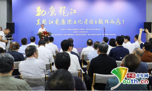 7月20日上午,由黑龙江省直机关工委、省文联共同主办,哈尔滨师范大学支持,黑龙江省美术家协会、摄影家协会、书法家协会、民间文艺家协会、哈师大美术学院共同承办的“勤廉龙江”黑龙江省廉洁文化建设主题作品展在哈尔滨师范大学美术馆启幕。