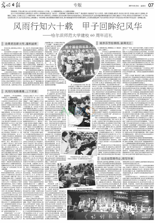 5月5日,《光明日报》在第7版整版刊发文章《风雨行知六十载,甲子回眸纪风华——哈尔滨师范大学建校60周年巡礼》,报道我校建校60年来所取得的辉煌成就。