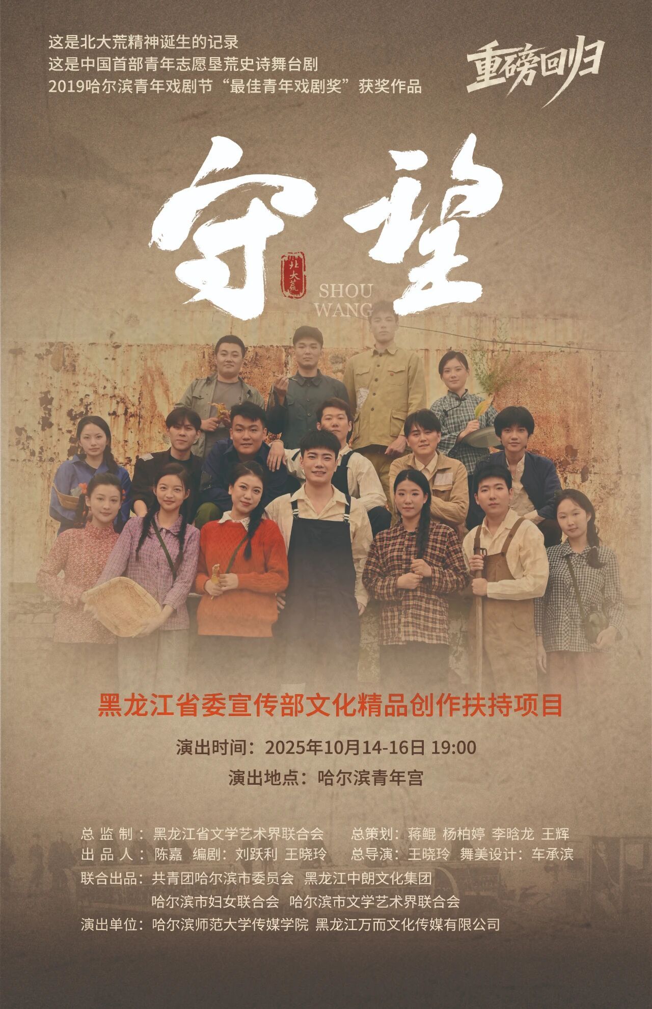 当舞台灯光亮起,一群20岁左右的年轻身影,身着粗布垦荒服,手持农具走向“荒原”—— 他们是哈尔滨师范大学传媒学院表演艺术专业的学生,此刻正化身70年前奔赴北大荒的青年志愿者,在话剧《守望》的舞台上,与先辈展开一场跨越时空的青春对话。