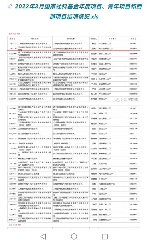 (李晓航/文)近日,全国哲学社会科学工作办公室公布了2022年3月国家社科基金项目结项情况,我校马克思主义学院段虹教授主持完成的国家社会科学基金项目“美育维度的高校思想政治教育工作创新研究”(17BKS130)以“...