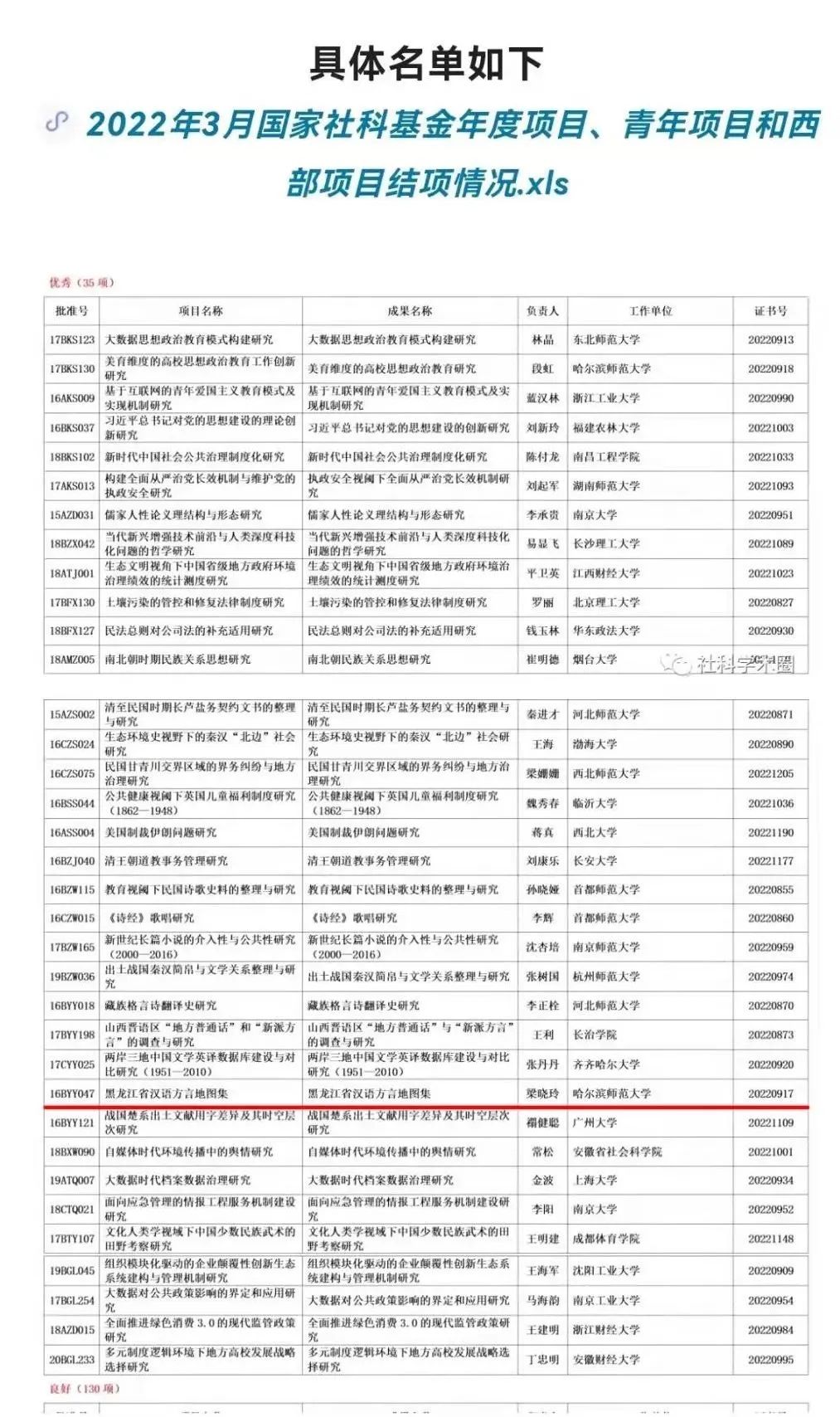 (李晓航/文)近日,全国哲学社会科学工作办公室公布了2022年3月国家社科基金项目结项情况,我校文学院梁晓玲教授主持完成的国家社会科学基金项目“黑龙江省汉语方言地图集”(16BYY047)以“优秀”等级结题。