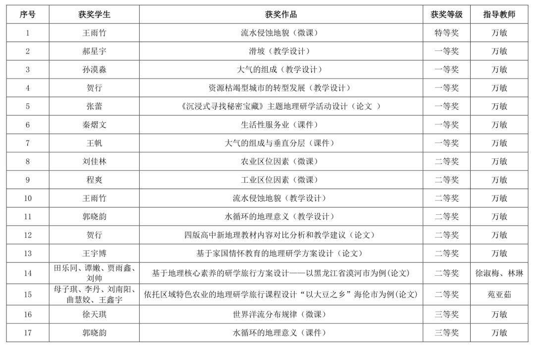 (万敏/文)日前,由全国优秀地理期刊、全国中文核心期刊《中学地理教学参考》编辑部举办的2022年全国优秀地理教研成果评比活动成绩揭晓,我校学生参赛作品荣获特等奖1项、一等奖6项、二等奖8项、三等奖2项。