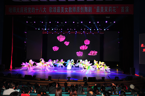 为了向党的十八大献礼,歌颂我校杰出校友“最美女教师”张丽莉,11月11日晚,由我校音乐学院根据张丽莉老师真实事迹改编的大型原创舞剧《最美茉莉花》在哈尔滨少年宫剧场正式上演。