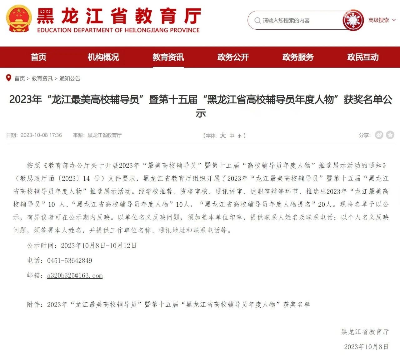 近日,由中共黑龙江省委宣传部、中共黑龙江省委教育工作委员会和黑龙江省教科文卫体工会联合主办,教育部高校思想政治工作队伍培训研修中心(哈尔滨师范大学)承办的2023年“龙江最美高校辅导员”暨第十五届“高校辅导员年度人物”推选展示活动圆满落下帷幕。本次活动推选出“龙江最美高校辅导员”10 人,“黑龙江省高校辅导员年度人物”10人,“黑龙江省高校辅导员年度人物提名”20人。经材料呈现、个人展示和评委...