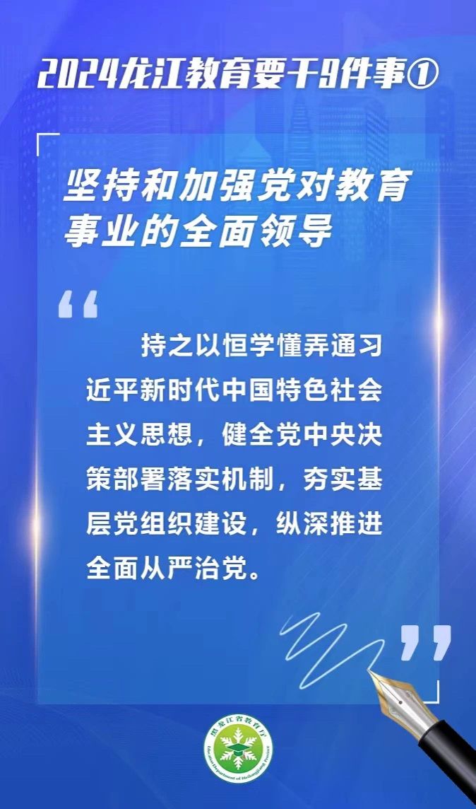 1月27日,2024年全省教育工作会议在哈尔滨召开。如何扎实推进助力教育强国建设、开创龙江高质量发展可持续振兴新局面的重点任务落地见效?9张大图带您看会上怎么说——