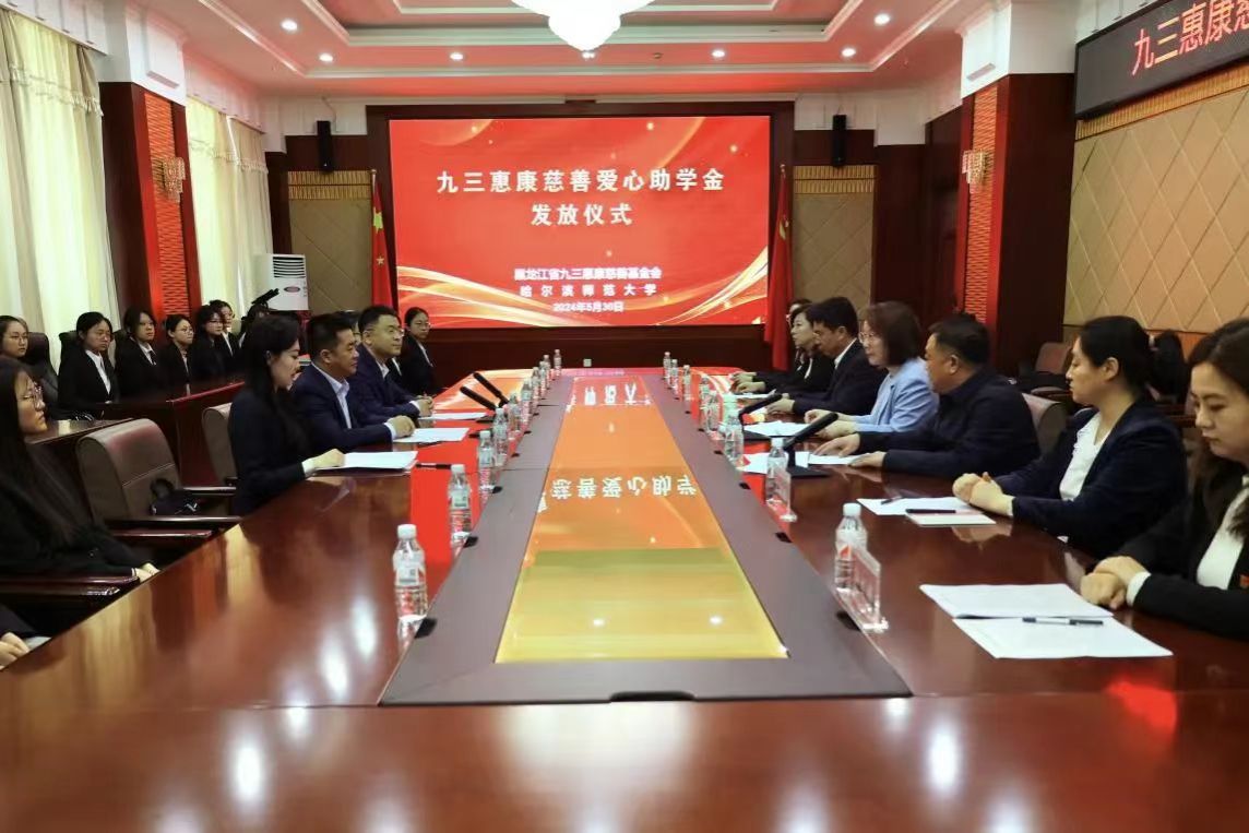 哈尔滨师范大学教育发展基金会九三惠康慈善爱心助学金发放仪式于5月30日在江北校区举行。校党委副书记、工会主席郭砾,九三食品股份有限公司党委书记、总经理王立庆,黑龙江省九三惠康慈善基金会理事长夏雷、秘书长陈晨,学生工作部(学生处、武装部)负责人以及资助中心工作人员、哈尔滨师范大学教育发展基金会代表、全体九三惠康慈善爱心助学金受助学生参加了发放仪式,仪式由学生工作部(学生处、武装部)部(处)长王彦庆主持。...