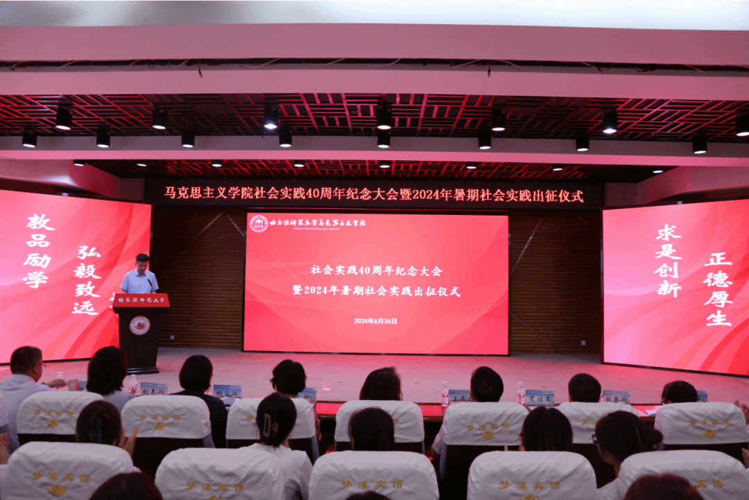 6月26日,我校马克思主义学院社会实践40周年纪念大会暨2024年暑期社会实践出征仪式在梦溪宾馆二楼报告厅隆重举行。学校党委副书记、工会主席郭砾,特邀嘉宾1992级思想政治教育专业优秀毕业生、黑龙江职业学院宣传统战部部长杨东辉,学生工作部(学生处、武装部)、团委、马克思主义学院负责同志参加纪念大会。大会由马克思主义学院党委副书记孙鹏飞主持。大会在社会实践40周年纪录片《踏遍青山人未老》中拉开序幕。纪录片追溯到20世纪80年代,