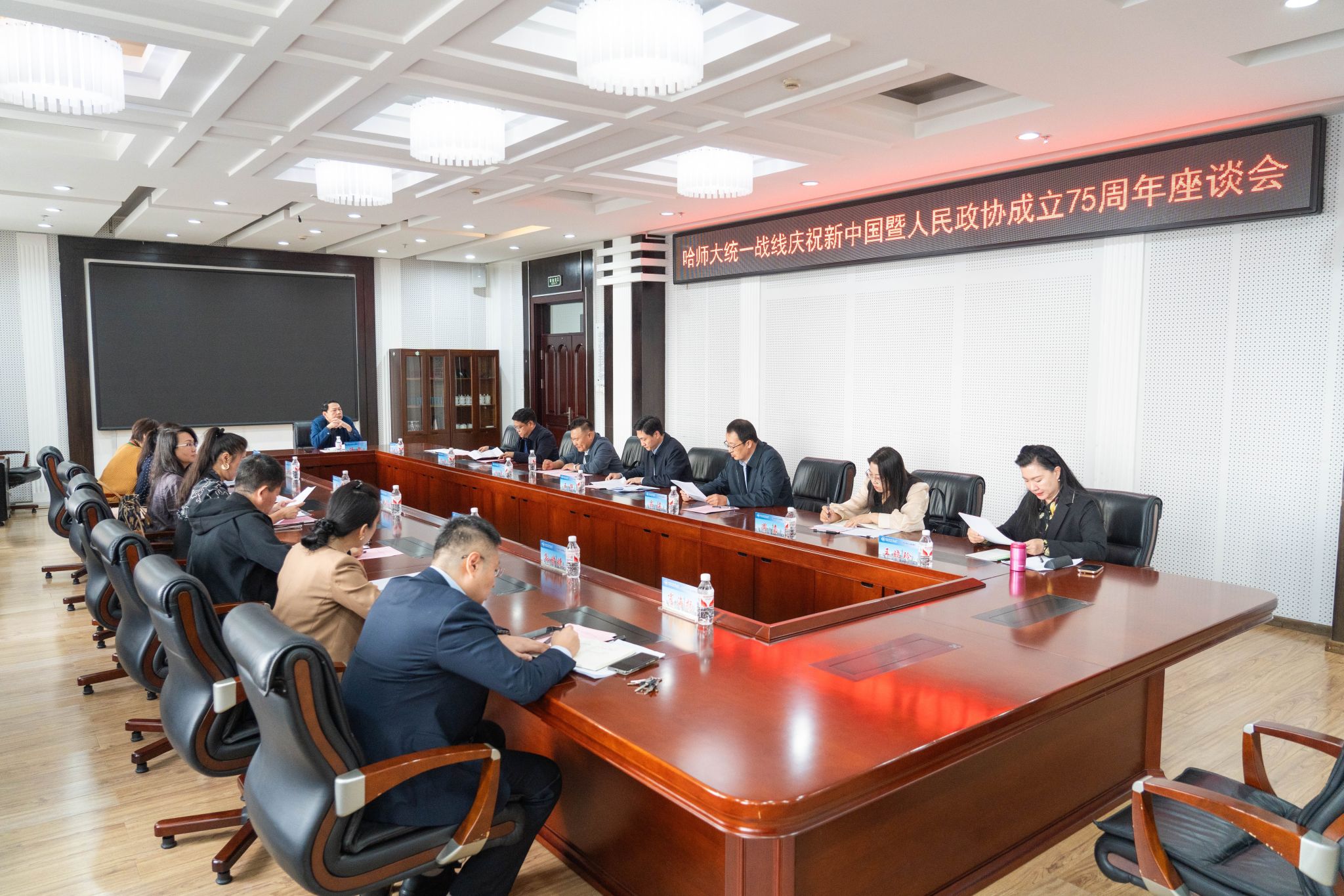 9月24日,学校统一战线在行知楼915会议室举行“忆峥嵘岁月,颂盛世华章”——庆祝新中国暨人民政协成立75周年座谈会,校党委副书记王辉参加会议并讲话,学校各民主党派基层组织负责人、无党派人士代表参加会议,党委统战部部长宿建主持会议。会上,王辉首先传达了习近平总书记在庆祝中国人民政治协商会议成立75周年大会上的重要讲话精神。各民主党派基层组织主委和无党派人士代表围绕新中国成立75周年,特别是习近平总书记在庆祝中国人民政治协商会议成立75周年大会上的重要讲话精神畅谈心得体会。...