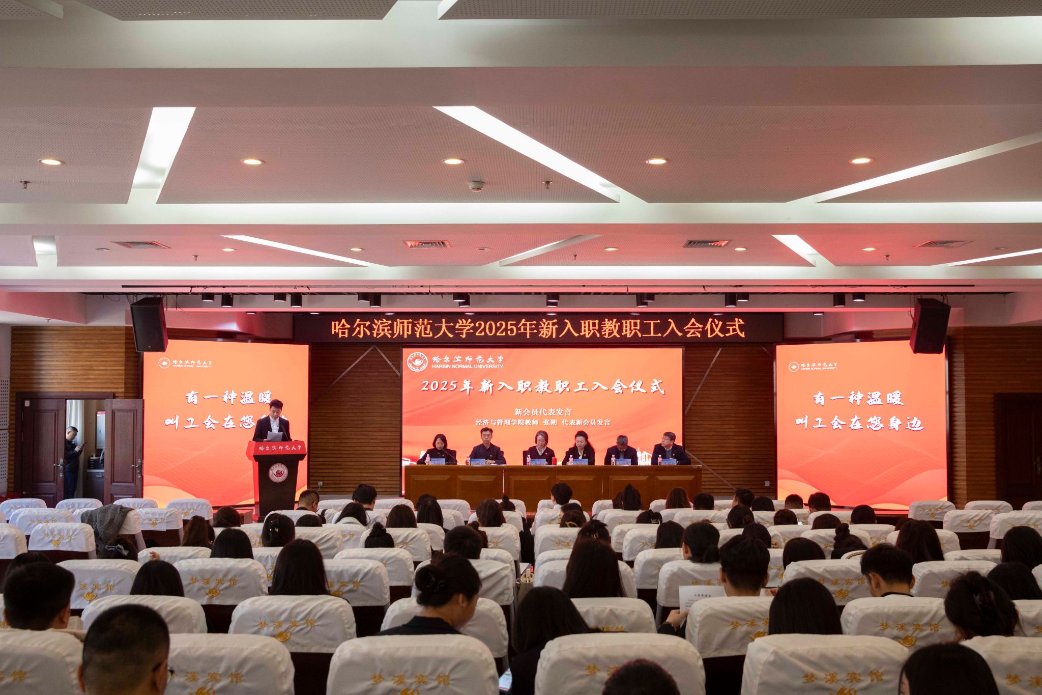 10月30日上午,我校2025年工会新会员入会仪式在主校区梦溪宾馆二楼报告厅举行。校党委副书记、工会主席郭砾出席仪式并讲话,党委常委、宣传部(党委教师工作部)部长张艳君,党委组织部、人事处相关负责人,校工会专职干部及新入职教职工参加仪式。仪式由校工会副主席李立平主持。仪式伊始,校工会常务副主席杨世君宣读《关于吸收新入职教职工加入工会组织的决定》,正式批准何佳宁、杨佳奇等96名新入职教职工成为工会会员。随后,他从“工会是什么、工会做些什么、加入工会的意义”三个维度介绍工会工作,系...