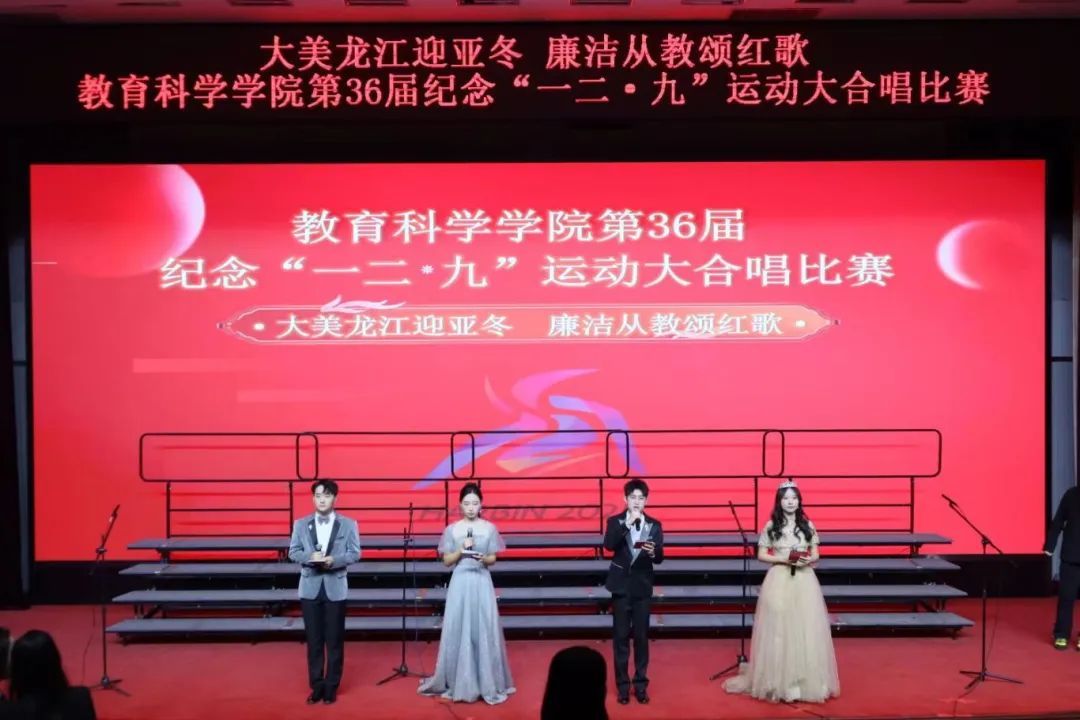 为庆祝大美龙江迎接亚冬盛事,弘扬廉洁从教的优秀风尚,传承并发扬“一二·九”爱国精神,培育学生民族情感,铸就爱国信念,赓续红色基因,绽放爱国风华,教育科学学院于12月11日下午13:30在科学会堂举办“大美龙江迎亚冬·廉洁从教颂红歌”第三十六届纪念“一二·九”运动八十九周年大合唱比赛。哈尔滨师范大学党委副书记、工会主席郭砾,党委常委、宣传部(教师工作部)部长张艳君,学生工作部(学生处、武装部)部(处)长王彦庆,校团委书记刘春玲,...