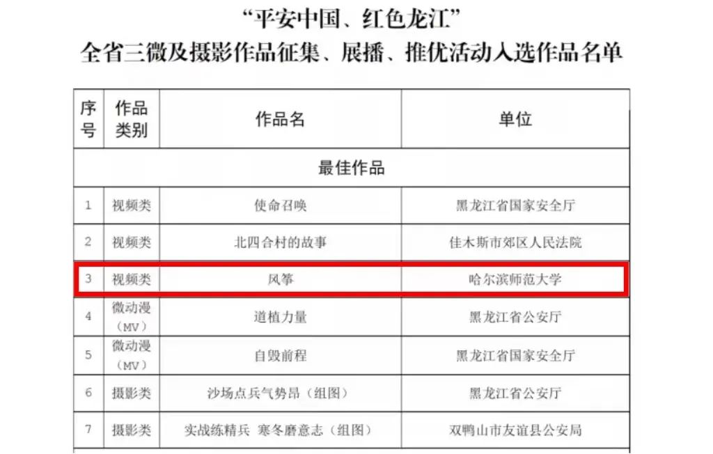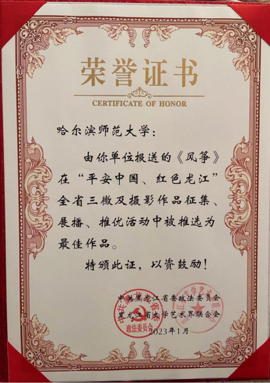 由哈尔滨师范大学纪委办公室、党委宣传部统筹策划,传媒学院师生团队摄制的微电影《风筝》,在中共黑龙江省委政法委员会、黑龙江省文学艺术界联合会联合组织开展的“平安中国、红色龙江”全省三微及摄影作品征集、展播、推优活动评选活动中被评为最佳作品。