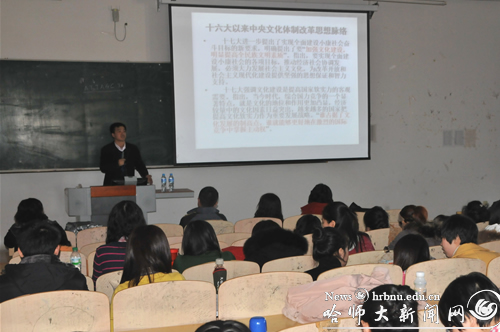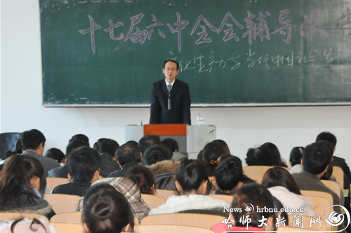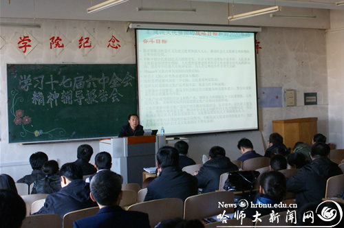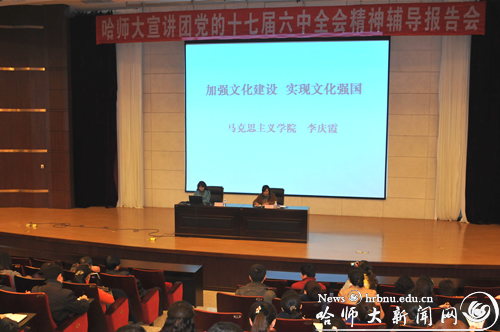 为深入学习领会党的十七届六中全会精神,进一步把全校党员干部、师生员工的思想和行动统一到全会精神上来,自11月16日开始,校党委宣讲团成员徐德荣、苗正达、李庆霞、刘爱军、张国启、陈宪良分别深入美术学院、国际文化交流学院、继续教育学院、体育科学学院、马克思主义学院、研究生学院、期刊社、教育科学学院、直属机关、基础教育学院、教师教育学院、实验中心、国有资产经营公司、物理与电子工程学院、化学化工学院、西语学院、公共英语教研部、社会与历史学院、文学院、图书馆、传媒学院、经济学院、政法学院、管理学院、后勤集团、生命科学与技术学院、地理科学学院、计算机科学与信息工程学院、音乐学院、艺术学校、离退休工作处、数学科学学院、东语学院、斯拉夫语学院为广大师生作辅导报告,集中宣讲十七届六中全会精神。