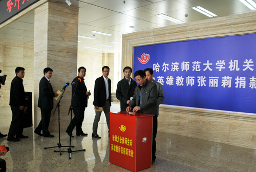为进一步弘扬张丽莉老师舍己救人的优秀品质和无私奉献的大爱精神,用真情关爱我校新一代毕业生的优秀代表,5月16日上午,机关党委组织全体机关干部在行知楼一楼大厅为我校2007届毕业生“最美女教师”张丽莉捐款。党委书记等学校党政领导及全体机关干部参加了捐款活动。党委副书记王为正在捐款仪式上讲话,机关党委副书记包志伟主持捐款仪式。
