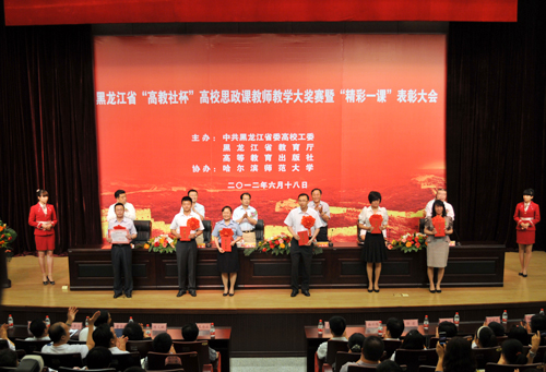 6月18日下午,由黑龙江省委高校工委、省教育厅和高等教育出版社主办、我校协办的2012年黑龙江省“高教社杯”高校思想政治理论课教师教学大奖赛暨“精彩一课”表彰大会在科学会堂举行。教育部社会科学司副司长徐维凡,省委高校工委书记、省教育厅党组书记、厅长张永洲,校党委书记,高等教育出版社社政出版中心主任马雷、销售部主任马景涛出席表彰大会。在哈高校负责思想政治理论课的领导和思政课教师参加表彰大会。大会由省委高校工委副书记、省教育厅党组成员李东明主持。