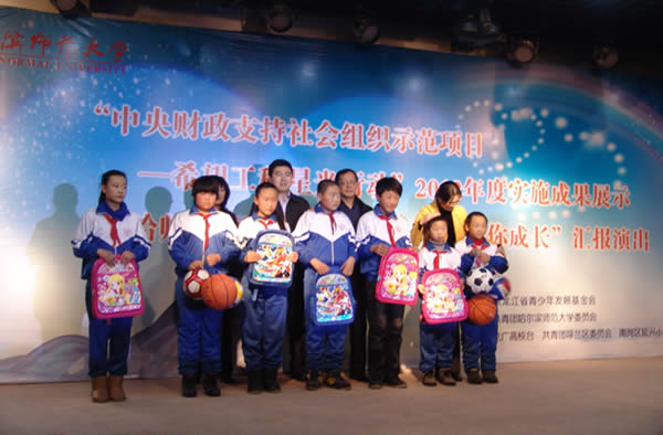 汇报演出中,哈师大“希望工程星光行动”的8支志愿者服务团队以VCR短片的形式回顾了开展关爱农民工子女活动半年来所经历的艰辛和取得的收获,同时也借助活动呼吁更多的人参与到关爱农民工子女的行列中来。随后与会领导为哈师大荣获“希望工程星光行动成长服务示范项目优秀志愿团队、优秀指导教师及优秀志愿者”的代表颁发荣誉证书。颁奖过后,受资助的呼兰区民主小学校孙旭言同学、哈师大“行知”青年志愿者陈静、南岗区延兴小学校校长王丹、学校党委副书记王为正和黑龙江省青少年发展基金会秘书长杨晶分别代表受资助同学、参与星光行动志愿者、对接学校和与会领导作了发言和讲话,并对我校的志愿服务团队给予了高度认可和评价。