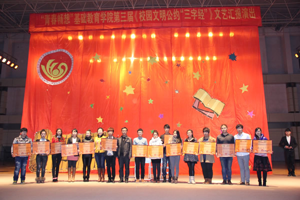 活动首先进行的是基础教育学院《校园文明公约“三字经”》征文比赛的颁奖仪式。征文比赛收到征文1000余份,经过认真评选评出一等奖10名、二等奖20名、三等奖30名、优秀奖40名,并评选出了最佳学习效果奖和最佳组织奖等集体奖。征文比赛优秀成果已被收录在学院刊物《端》专刊《向十八大献礼》中。