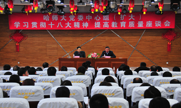 12月17日下午,校党委中心组(扩大)学习贯彻十八大精神,提高教育质量座谈会在梦溪宾馆二楼会议室召开。校党委书记等理论学习中心组成员出席,全校各单位党、政主要负责人,全体机关干部参加座谈会。座谈会由党委副书记王为正主持。