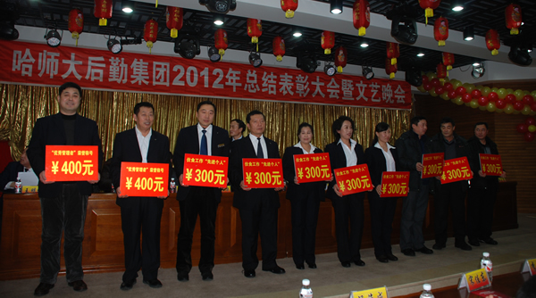 12月26日下午,后勤集团2012年总结表彰大会暨文艺演出在松北校区梦溪宾馆二楼报告厅隆重举行。校党委书记出席会议并讲话,总会计师李金贵出席会议。学校办公室、学生工作处、团委、财务处、国有资产管理处、保卫处、基本建设办公室、后勤管理处、国有资产经营公司、实业公司、医院等部门领导出席会议并观看了精彩的文艺演出。后勤集团党政领导及各部门(中心)主任、副主任、获奖代表和部分员工代表300余人参加了大会。会议由后勤集团党委书记王明刚主持。