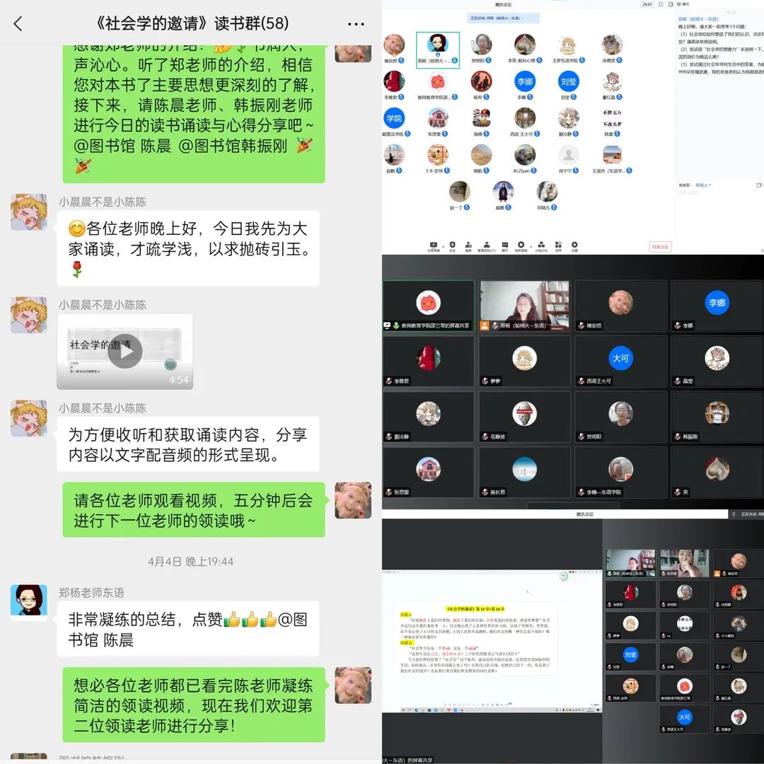 郑杨老师领读的《社会学的邀请》让我们通过社会学的视角感受个体对社会中不同年龄、不同视角、不同经历群体的包容。教师们通过制作微视频、PPT以及腾讯会议直播等形式分享阅读感悟,看到、看清、看懂生活中的不同个体、社会与事情本身的联系。郑杨老师在分享会中提到:“社会不是我们拥有的东西,而是我们要去创造的东西。我们对个人主义模型的过于依赖,以及对社会力量作用的过于低估,代表着对自由图景的歪曲认识。对于自我和社会之间的关系以及差异性后果的正确评价,可以让我们作出更加明智的选择,更好地塑造未来。”