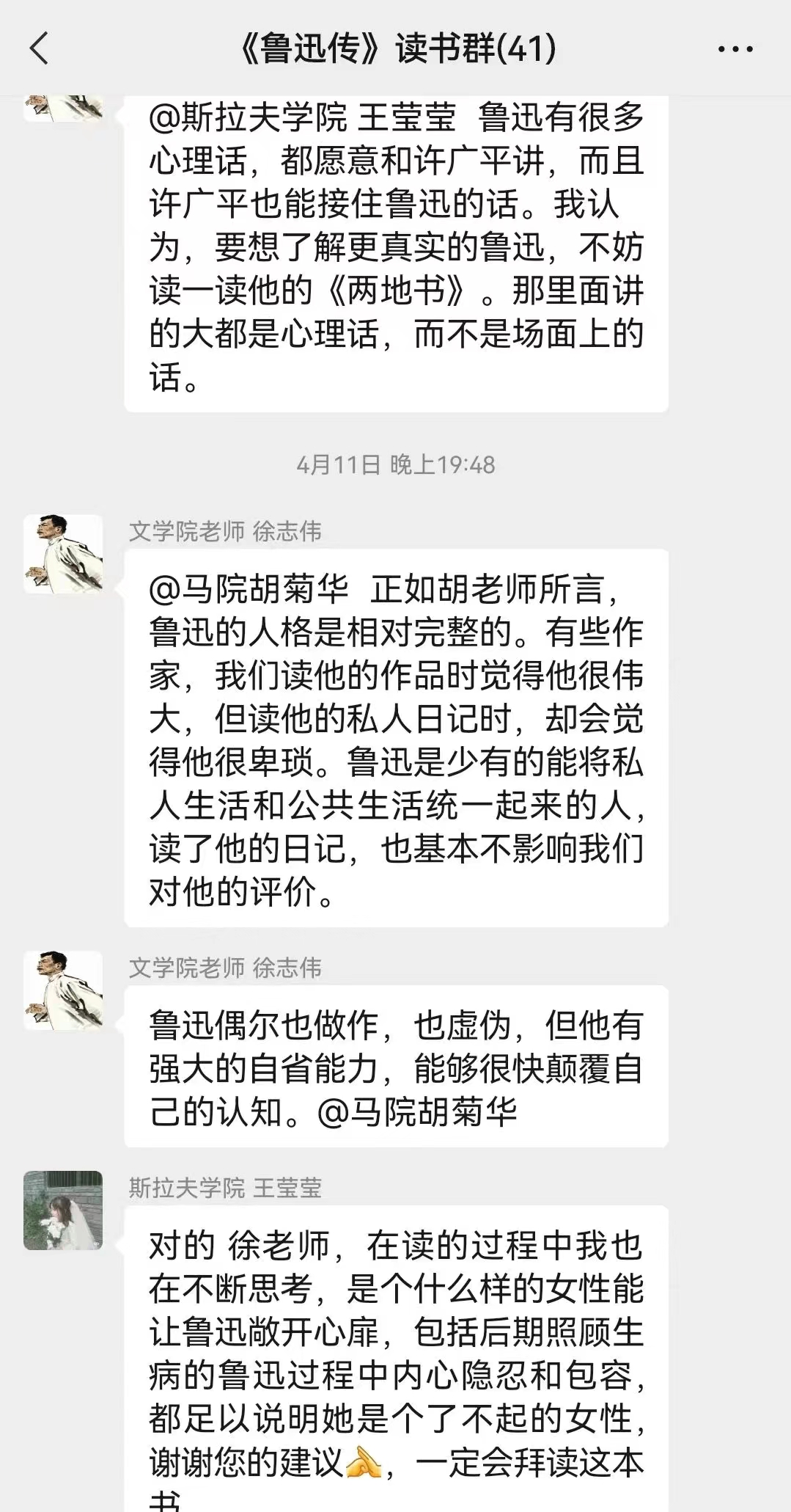 徐志伟老师领读的《无法直面的人生:鲁迅传》带领大家走进了“鲁迅的世界”中,感受着一代文坛宗师鲁迅先生作为“孤勇者”砥砺前行、于历史长河中挣扎的勇气。活动中,教师们通过制作朗读微视频、录制音频等形式分享心得感悟,跨过历史长河在白纸黑字中感触着鲁迅先生人生阶段的起伏。徐志伟老师在读书会总结时提到:“读一本传记,仿佛是陪着别人经历了一生。即使不是这样,至少也感受到了不一样的人生,这有助于我们反观自身的生活,思考人生的意义与方向。”