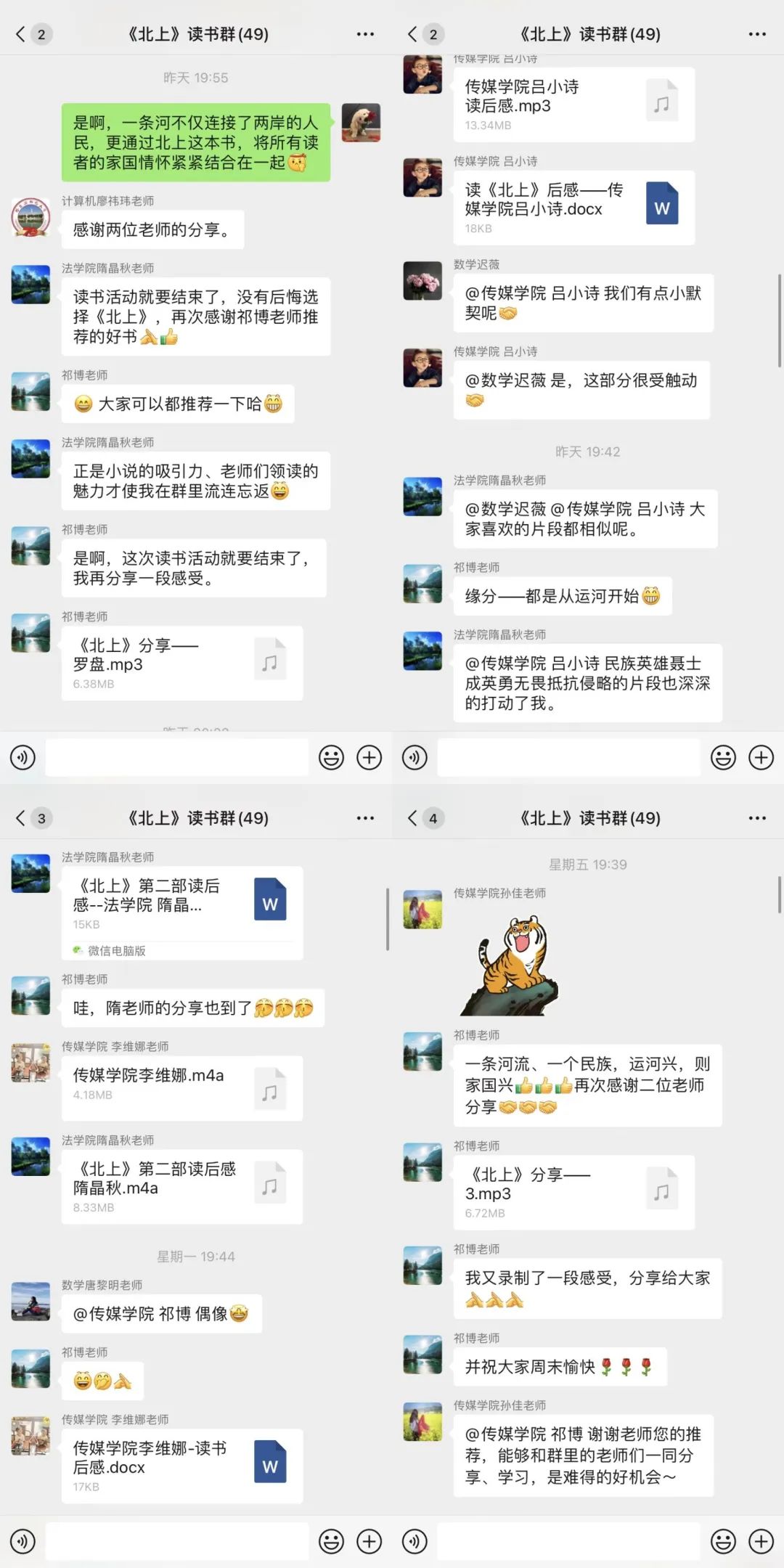 祁博老师领读的《北上》一书,沿着京杭大运河的脉络,带领大家纵观中国历史的百年沧桑巨变。活动分为“读”“思”“品”“悟”四个环节,丝丝入扣,方向鲜明;参与教师在活动期间积极录制音频诵读、分享读书感悟,与领读教师探讨书籍内涵,交流朗诵经验,品读名著之余拉近彼此距离,氛围和谐热情。祁博老师说到:“一条河流养育一个民族,运河兴,国运兴。”读完此书,教师们的目光已从河流两岸延伸至祖国大江南北,更深层地体会到历史的力量与中华民族的独特魅力。