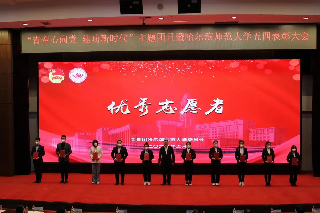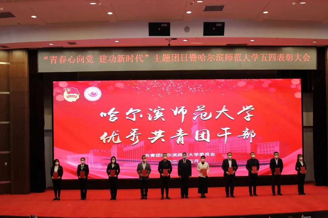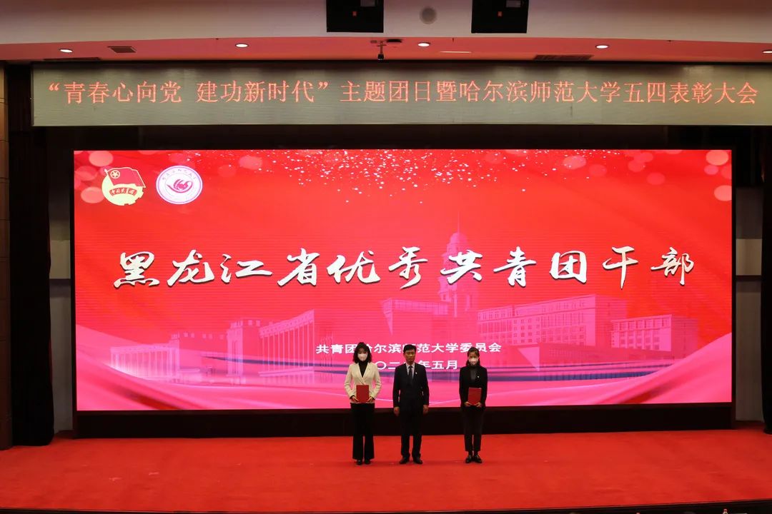 表彰大会上,郑方明宣读了表彰决定。与会领导为“中国青年五四奖章”获得者东语学院2019级学生刘羲檬,省“优秀共青团干部”获得者化学化工学院团委书记刘倩、哈师大附属中学团委书记唐丹丹,省“五四红旗团支部”获奖支部美术学院环境艺术设计2019级04班团支部,省“优秀共青团员”传媒学院2020级学生田孟昕颁奖。同时为2021年度校“青年五四奖章”、“五四红旗团委”、“五四红旗团支部”、“优秀共青团干部”、“优秀共青团员”以及“优秀志愿者”颁发奖杯、证书。
