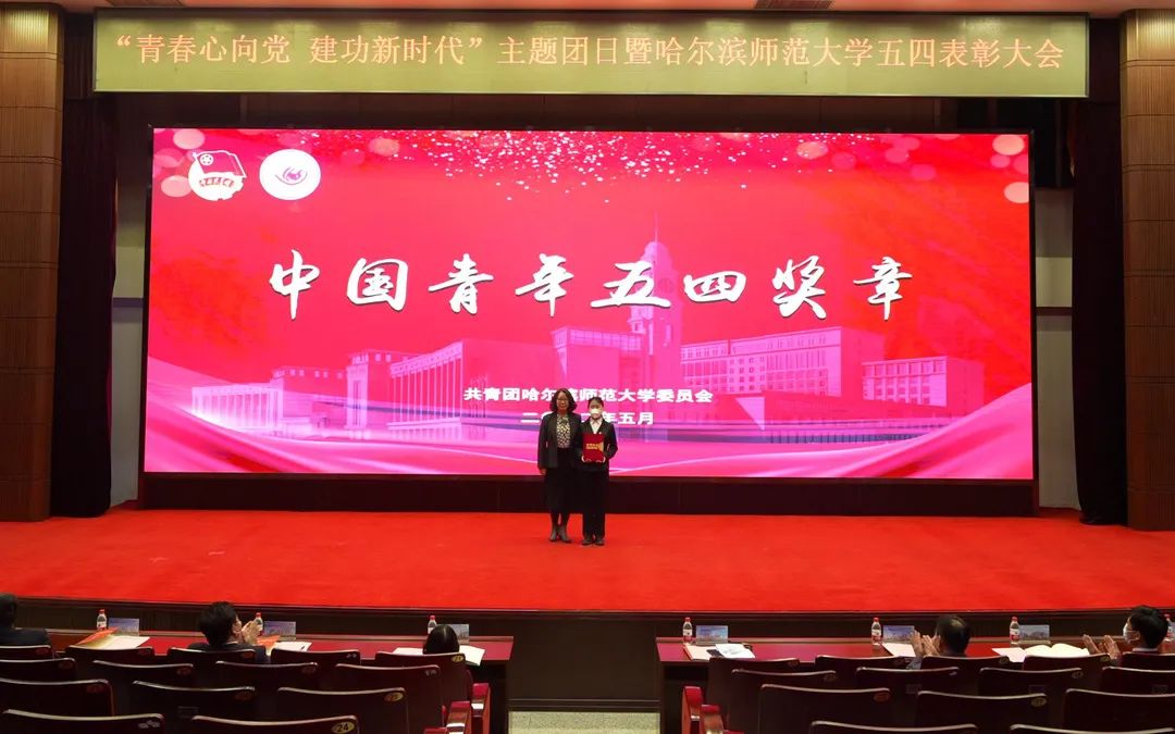 图 校党委副书记李庆霞为哈尔滨师范大学“青年五四奖章”获得者颁奖