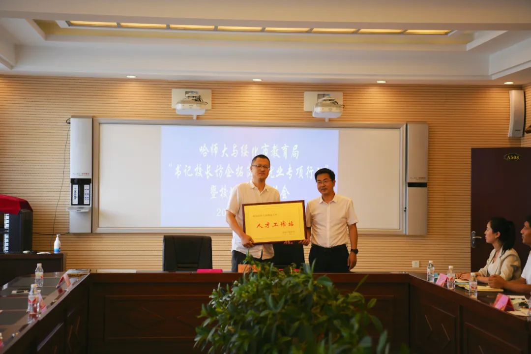 座谈会上,我校与绥化市教育局互授“哈尔滨师范大学就业基地”“绥化市驻哈尔滨师范大学人才工作站”牌,双方签署就业合作协议。