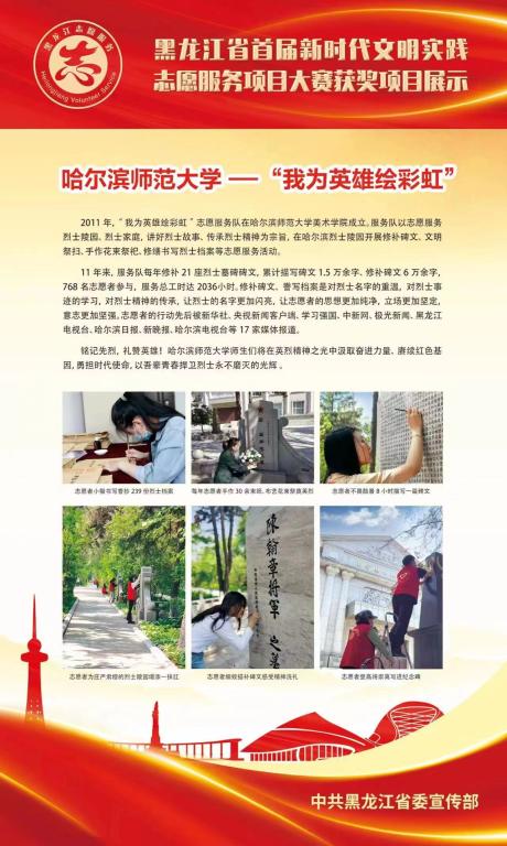 黑龙江省首届新时代文明实践志愿服务项目大赛是由省文明办主办、省志愿服务基金会承办的全省顶级志愿服务项目大赛,大赛从开赛到决赛历时4个多月,从200余个申报项目中遴选出100个优秀志愿服务项目。共评选出金奖项目5个、银奖项目10个、铜奖项目15个、创意奖项目30个、优秀奖项目40个,其中我校美术学院《“我为英雄绘彩虹”志愿服务项目》在省委教育工委报送的10个重点项目中脱颖而出,最终获得银奖,成为省委教育工委报送项目中的最高奖项。