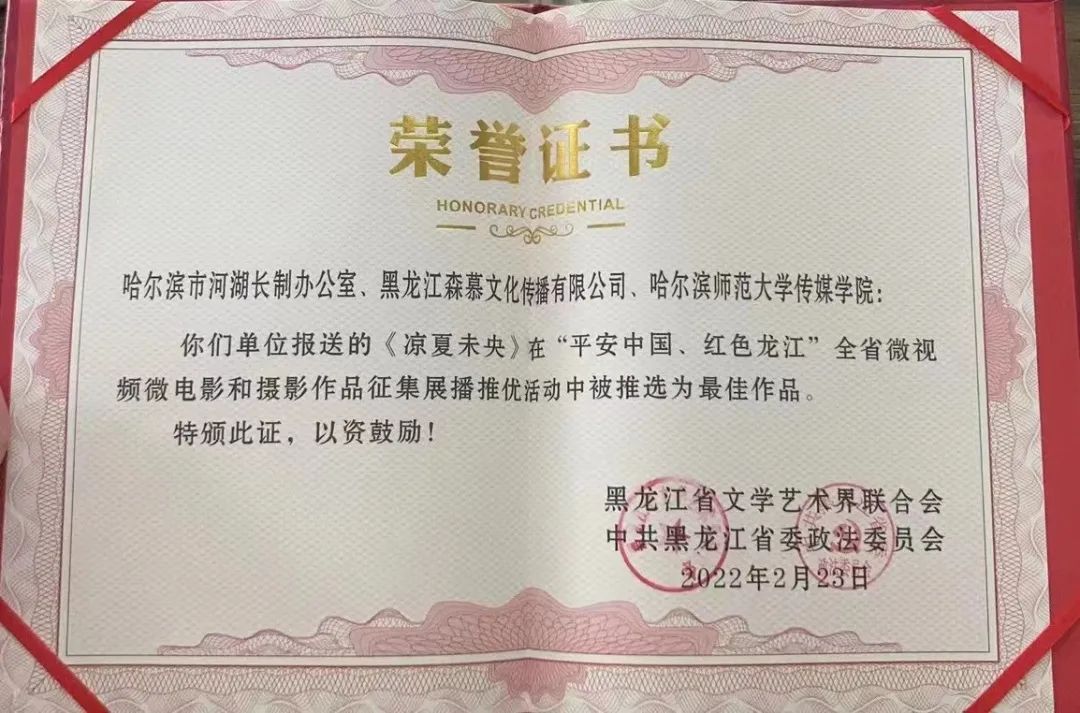 此外,该片还荣获全国“守护美丽河湖”短视频公益大赛优秀奖;黑龙江省文联、省委政法委主办的“平安中国,红色龙江”微电影征集展播最佳影片。