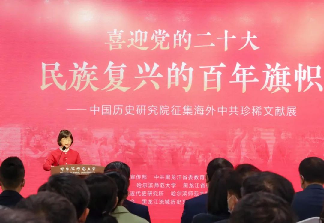 为深入推进党史学习教育常态化长效化,以实际行动迎接党的二十大胜利召开,10月12日,“喜迎党的二十大 民族复兴的百年旗帜——中国历史研究院征集海外中共珍稀文献展”以线上线下相结合的方式在我校美术馆开幕。本次活动由中共黑龙江省委宣传部、黑龙江省委教育工委指导,中国历史研究院、哈尔滨师范大学、黑龙江省社会科学界联合会主办,中国社会科学院近代史研究所、哈尔滨师范大学历史文化学院、黑龙江省历史学会、黑龙江流域历史文化学术交流基地、黑龙江省红色文化研究中心联合承办。校党委书记孙立军,党委副书记李庆霞,党委常委、人事处处长李世彬出席开幕式。中国历史研究院近代史所副所长金以林,黑龙江省委宣传部副部长郝文斌,黑龙江省社会科学界联合会党组书记、副主席刘德权,黑龙江省社会科学界联合会副主席、党组成员王宏宇,黑龙江省档案馆二级巡视员刘伟,黑龙江省历史学会会长李凤飞,中央党史和文献研究院第二研究部周恩来研究处副处长邵建斌等受邀参加开幕式。李庆霞主持开幕式。