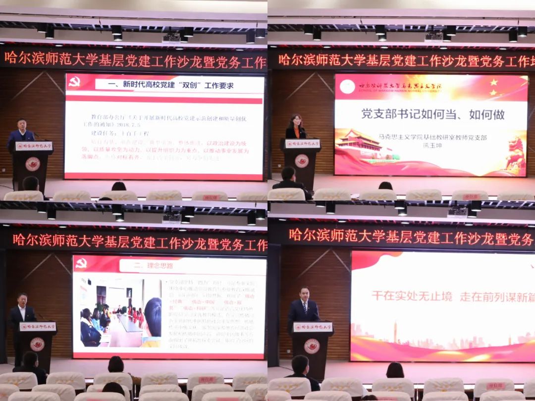 会上,四位党组织书记进行党建工作经验介绍。全国党建标杆院系、全省基层党建示范点、马克思主义学院党委书记宋佳东做了题为《新时代高校标杆院系创建工作探索与实践》的主题报告;第二批全国党建样板支部、斯拉夫语学院研究生党支部书记阿庆喜做了题为《对标七个有力,深化四种模式,打造样板党支部》的主题报告;第三批全国党建样板支部、直属机关后勤管理处党支部书记徐福水做了题为《干在实处无止境 走在前列谋新篇》的主题报告;首批全国党建样板支部、全省教师党支部书记工作室、全省基层党建示范点、马克思主义学院基础教研室教师党支部书记熊玉坤做了题为《党支部书记如何当 如何做》的主题经验交流。四位党组织书记的报告图文并茂、报告内容丰富、亮点突出、事例详实,总结了党组织的工作成绩,提炼了党组织工作特色,进一步扩大示范效应,为接下来全校各基层党组织开展党建“双创工作”起到了一定的指导和促进作用。