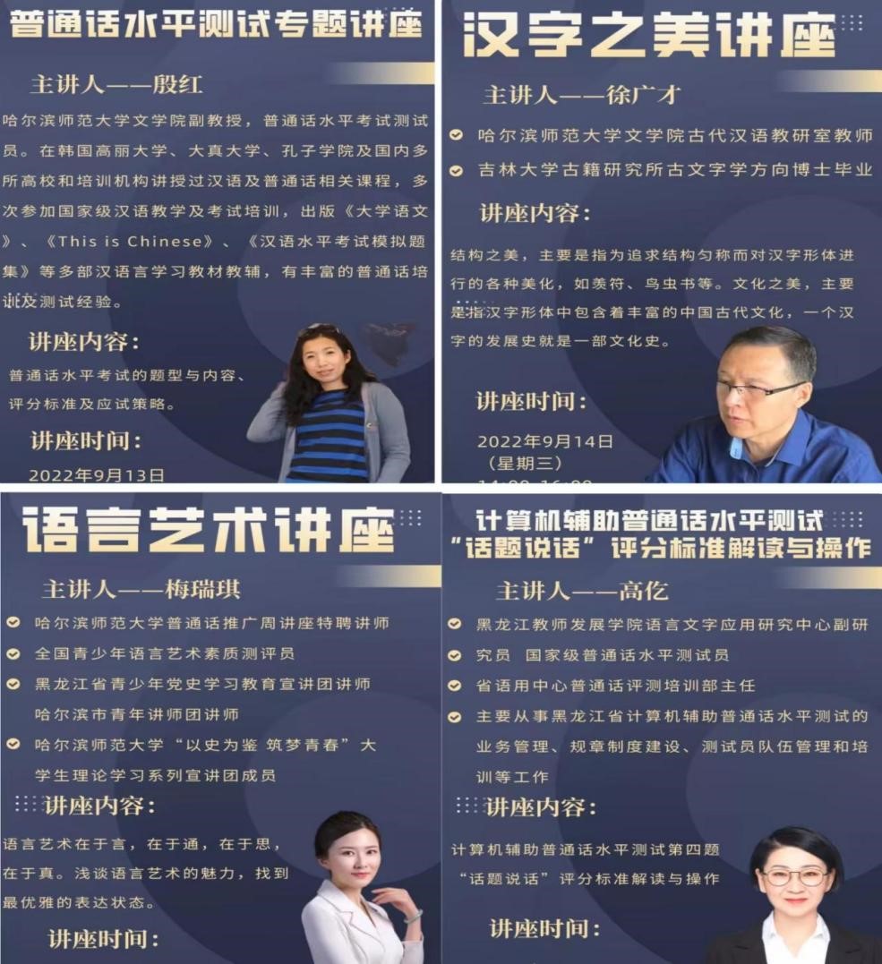 活动期间,邀请文学院副教授殷红老师、文学院古代汉语教研室徐广才老师、哈尔滨市青年讲师团讲师梅瑞琪老师和国家级普通话水平测试员高仡老师为我校学生讲座授课,分为“普通话水平测试专题”、“汉字之美”、“语言艺术”和“计算机辅助普通话水平测试‘话题说话’评分标准解读与操作”四个部分。进一步了解普通话在铸牢中华民族共同体意识、增强对祖国语言文字的深厚感情,坚定讲好普通话的信念,调动广大师生推普学普的积极性,促进语言文字工作向纵深发展,在校内形成浓郁的推普学普氛围。