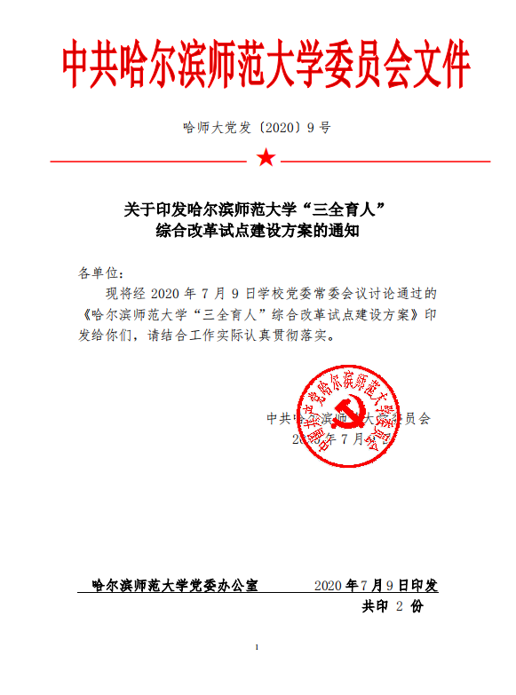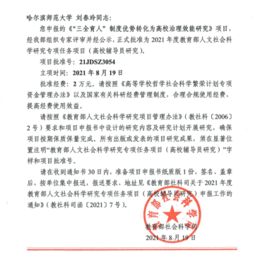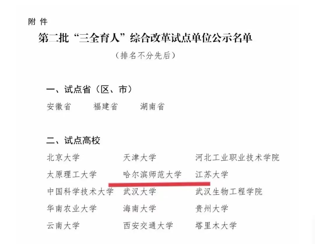 顶层设计取得良好效果。学校先后出台了《加强和改进新形势下思想政治工作的实施意见》《学生思想政治教育“主渠道”与“主阵地”一体化工作方案》《大学生思想政治教育“112349”工作模式实施方案》《哈尔滨师范大学“三全育人”综合改革试点建设方案》等文件,统筹推进大学生思想政治教育工作。2018年,我校《“112349”一体化实践育人模式探索》获批教育部高校思想政治工作精品项目。2019年,学校成功入选教育部“三全育人”综合改革试点单位,成为全国25所试点高校之一,相关工作经验被中国教育电视台等主流媒体广泛宣传报道,并在全国高校“三全育人”综合改革研讨会上作交流发言。