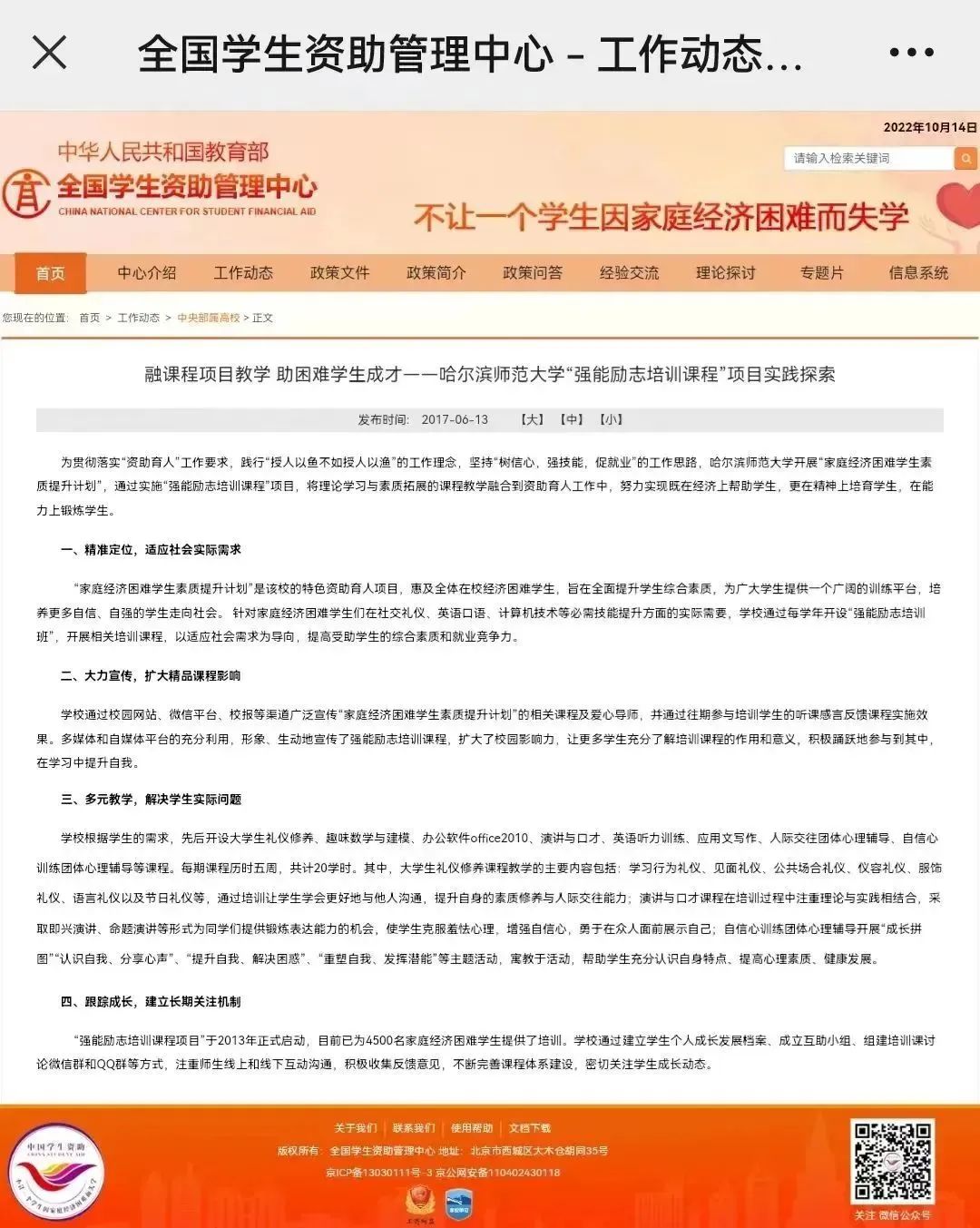 资助育人落实到位。2016年,学校出台了《家庭经济困难学生认定工作实施细则》,切实提高资助工作的科学性、针对性和实效性。学校以“励志强能,助学育人”作为资助工作的根本出发点和落脚点,把“扶困”与“扶智”,“扶困”与“扶志”结合起来,建立国家资助、学校奖助、社会捐助、学生自助“四位一体”的发展型资助体系,形成了“志助、智助、自助”的“三助”育人思路。学校坚持开展“诚信、感恩、励志”主题教育活动,连续12年为家庭经济困难学生免费开设“素质提升课程”,有数万名学生参加了培训并结业,实现了“志智双扶,自助成才”的工作目标,培养了受助学生自立自强、诚实守信、知恩感恩、勇于担当的良好品质。近年来,我校资助育人工作成绩突出,被评为省级“学生资助工作单位典型”,连续2次获“黑龙江省国家奖学金学生风采”先进组织奖。