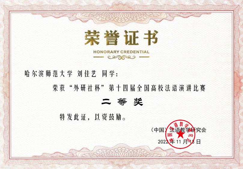 11月13日,我校西语学院法语专业学生刘佳艺,在第十四届“外研社杯”全国高校法语演讲比赛总决赛中夺得第二名,荣获国家二等奖。
