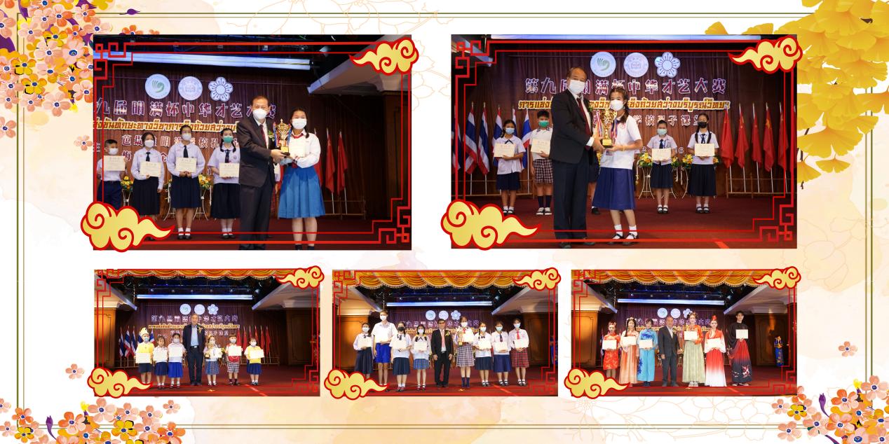 经过选手们激烈的角逐,最终来自东英学校的宋萍获得中国古典乐器的一等奖;来自北榄培华学校的马英文、公立文益学校的秋萌、芭堤雅明满学校的夏璇分别获得幼儿园组、小学组及中学组中文歌曲一等奖;来自光华学校的《唐宫夜宴》表演团队获得中华舞蹈一等奖;来自光华学校的杨书妍及芭堤雅明满学校的窦士轩获得书法项目小学组、中学组一等奖;来自北榄培华学校的叶露、芭堤雅明满学校的吴淑平获得中文诗歌朗诵项目小学组、中学组一等奖;来自北榄培华学校学校的叶朵儿及光华学校的夏雨获得讲中国故事项目小学组、中学组一等奖。