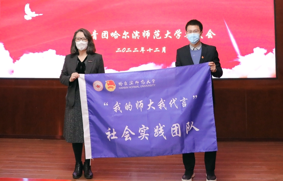 出征仪式上,校团委副书记徐慧文受招生工作处委托介绍了“我的师大我代言”社会实践的活动背景。校党委副书记、工会主席郭砾为实践团队授旗并向各实践团队发放宣传手册、防疫包等活动物资。
