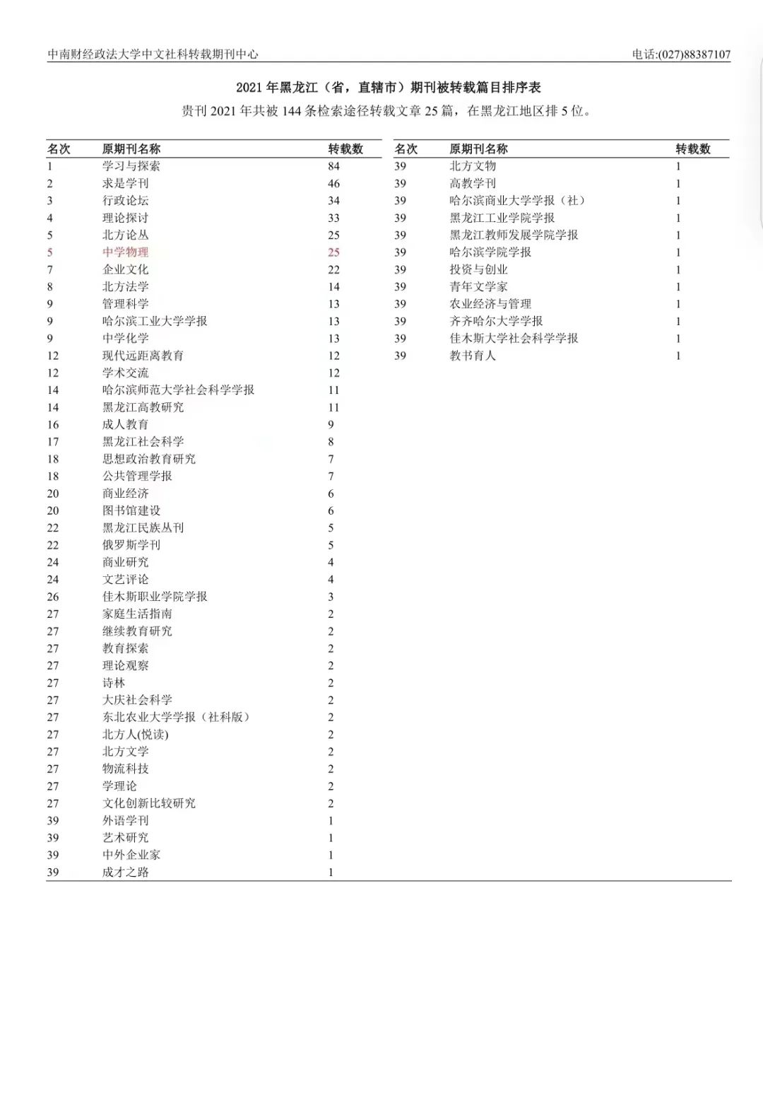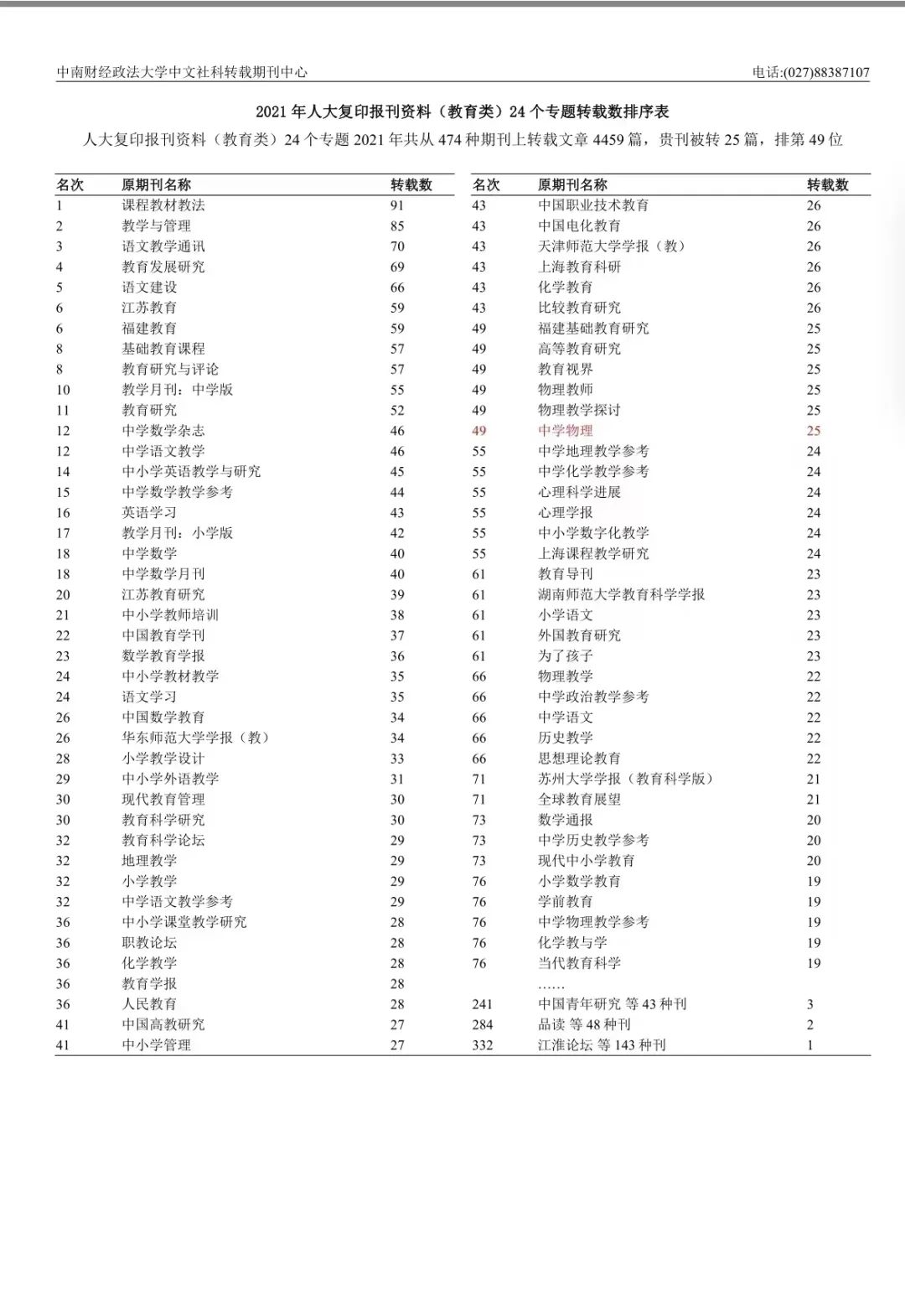 (孙宝东/文)近日,中国人民大学书报资料中心发布了2022年度人大复印报刊资料《中学物理教与学》全文转载量排名数据,我校主管主办的《中学物理》期刊被全文转载23篇/165篇,占总量13.9%,超过核心期刊《物理教学》,跃居全国基础教育教学(物理)类第2名,年度转载量近五年增幅近200%,体现了我校期刊学术地位在不断提升,行业影响和专业声誉在不断扩大。中国人民大学复印报刊资料是中国人文社会科学领域公认的国家级权威性刊物,是我国核心期刊评选、评价人文社会科学期刊学术影响和人文社会科学研究成果水平的重要参考依据之一。