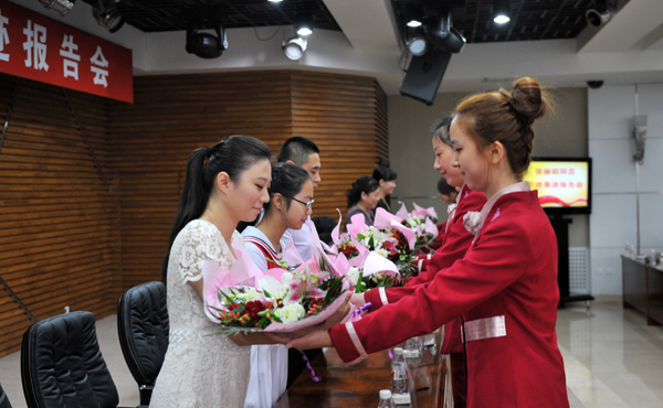 图 工作人员向报告团成员献花
