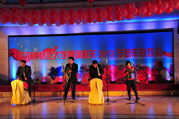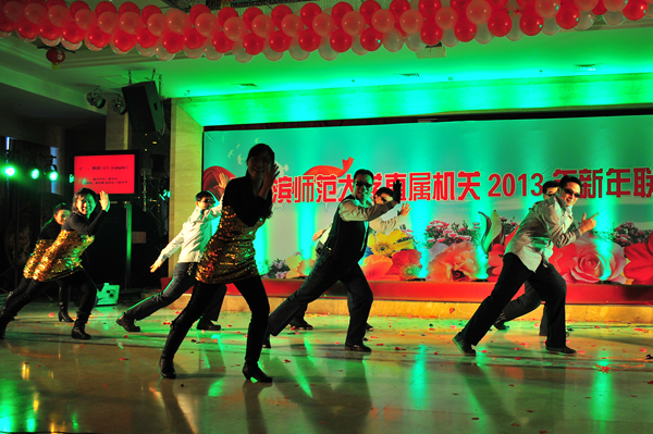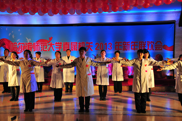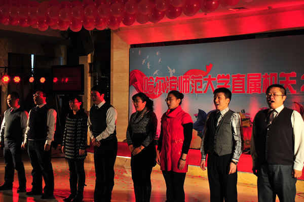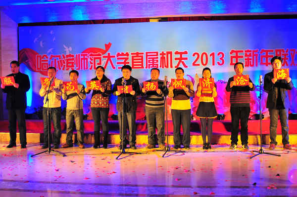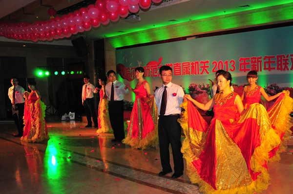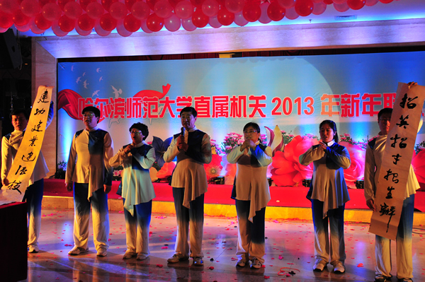 踏歌起舞辞旧岁,欢声笑语迎新年。2012年12月27日下午,松北校区梦溪宾馆金色大厅内张灯结彩,欢声笑语,一派浓浓的节日喜庆氛围,直属机关2013年新年联欢会在此隆重举行。校党委书记,校长王选章,党委副书记王为正,党委常委、副校长徐晓风,党委常委、纪委书记蒋晶洁,党委常委、工会主席张国昭,党委常委、党委组织部部长尹占军,总会计师李金贵等领导及直属机关全体干部职工欢聚一堂,共贺新年。