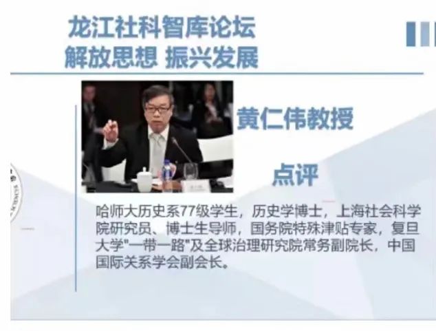 在专家点评中,黄仁伟教授认为历史文化学院教师的主题发言本着立足龙江、引领学术、服务社会的宗旨,具有大局观、历史观和文化观,从全省、全国以及国际角度,将龙江文化、历史、旅游三者充分结合,通过学术理论研究,促进文化振兴。黄仁伟教授还指出了在当前国际形势下黑龙江文化发展面临的机遇和挑战,龙江文化振兴要有国际化视野。周颂伦教授在点评中重视冰雪文化,主张扩展龙江红色文化研究,深入挖掘少数民族文化,重视国防安全和粮食安全,强调文化自信,实现龙江文化繁荣。