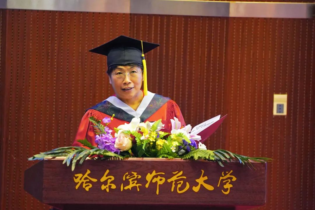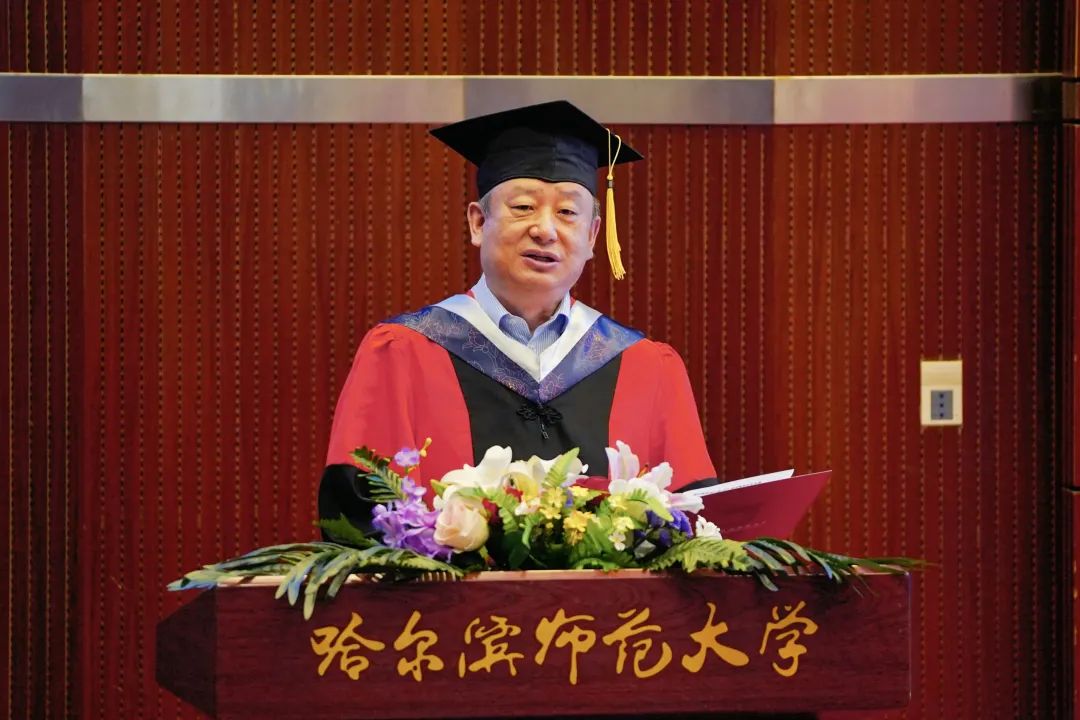 校学位评定委员会主席、校长、博士研究生导师孙立军教授在致辞中,代表全校师生员工向被授予学位的9407名毕业生表示诚挚的祝贺。孙立军深情寄语广大毕业生在磨砺中成长,在挑战中前行,在赓续奋斗中留下无悔青春。希望同学们心怀“国之大者”,树立远大理想。赓续哈师大光荣传统,坚定不移听党话、跟党走,把自己的小我融入祖国的大我、人民的大我之中,立志民族复兴,不负韶华,不负时代,不负人民,以实现中华民族伟大复兴为己任,让青春之花在新时代的不懈奋斗中绽放出绚丽的光彩!希望同学们坚守科学精神,勇于开拓创新。热爱祖国,追求真理,坚定自立自强、自主创新的信心和决心,树立勇于攻克“卡脖子”等关键核心技术的雄心壮志,敢于提出新理论、开辟新领域、探索新路径,永远走在创新的前列,成为开拓创新的时代先锋。希望同学们永远脚踏实地,实干成就未来。“用脚步丈量祖国大地,用眼睛发现中国精神,用耳朵倾听人民呼声,用内心感应时代脉搏!”用青春的智慧和实干的汗水打拼出一个更加美好的中国!最后,孙立军期待广大毕业生在人生的舞台上,演绎更加精彩的“千禧攻略”!在青春的赛道上,跑出当代青年的最好成绩!在实现中华民族伟大复兴中国梦的新征程上,奋勇前进,再立新功!