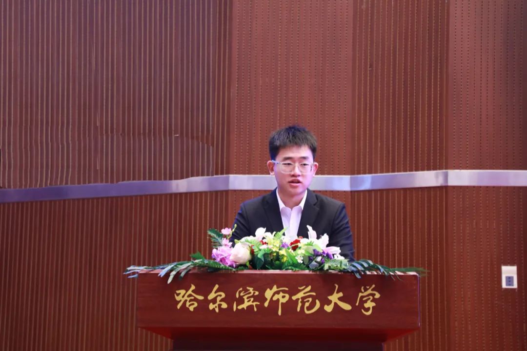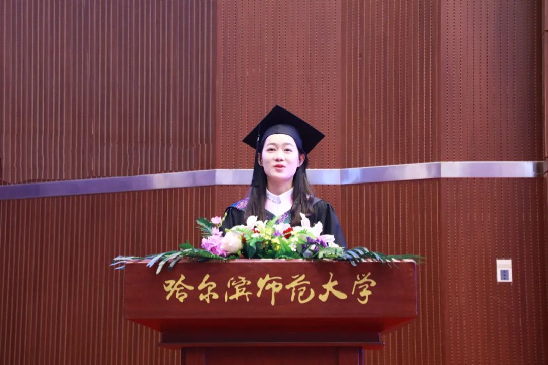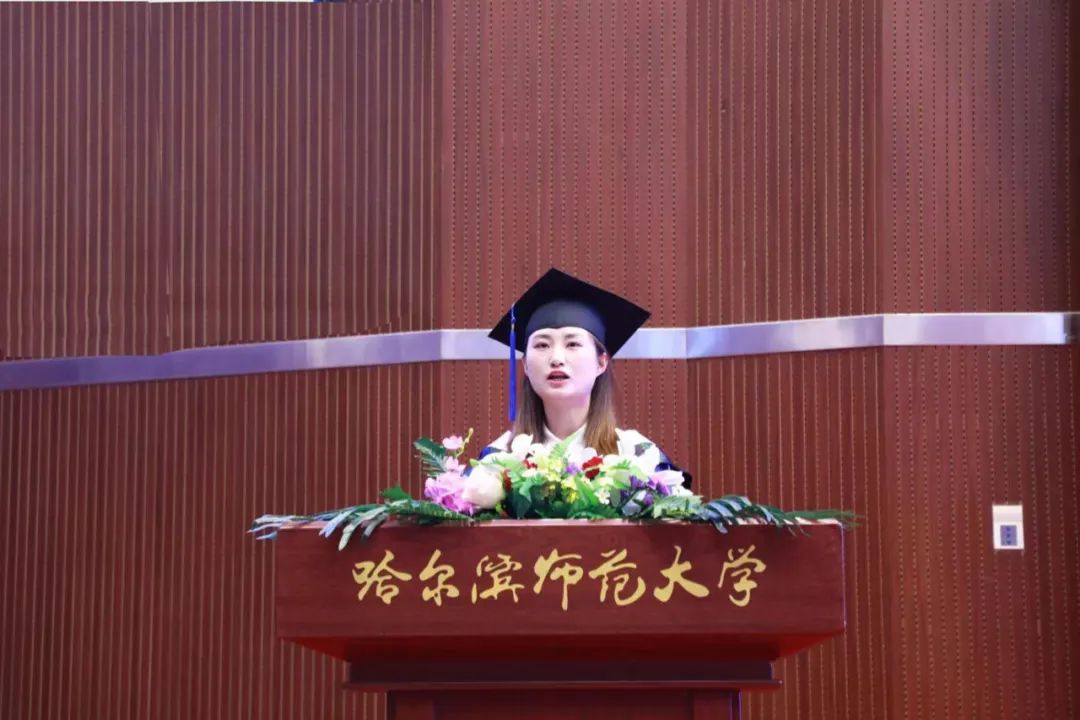 在校生代表、校第22届学生会执行主席、地理科学学院2020级学生兰品宽真诚地表达了对毕业生毕业的不舍与感谢,表示未来将以学姐学长为榜样,用青春朝气与努力拼搏,为哈师大增光添彩,并祝福学姐学长此去光明璀璨,前程锦绣。