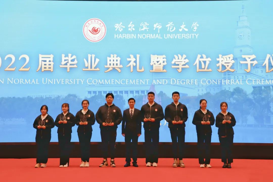 伴随着欢快而喜庆的乐曲,党委常委、纪委书记、省监委驻哈尔滨师范大学监察专员姜国庆为2022届优秀毕业生代表颁发荣誉证书;党委常委、副校长尹剑锋为“大学生志愿服务西部计划”志愿者代表颁发纪念奖牌;党委常委、副校长王辉为“助力兴边富民计划”志愿者代表颁发纪念奖牌;党委常委、副校长徐国峰为“宁齐堃”奖学金、“田家炳优秀师范生”奖学金获得者代表颁发证书。