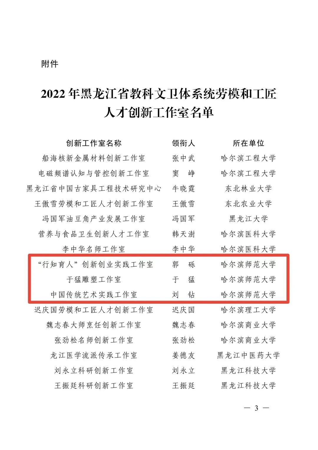 (李嘉炜/文)日前,2022年黑龙江省教科文卫体系统“劳模和工匠人才创新工作室”评选结果揭晓,33家创新工作室脱颖而出,由我校推荐的党委副书记、工会主席郭砾领衔的“行知育人”创新创业实践工作室、美术学院副院长刘钻领衔的中国传统艺术实践工作室、美术学院雕塑系主任于猛领衔的于猛雕塑工作室三支团队荣获黑龙江省教科文卫体系统“劳模和工匠人才创新工作室”荣誉称号。