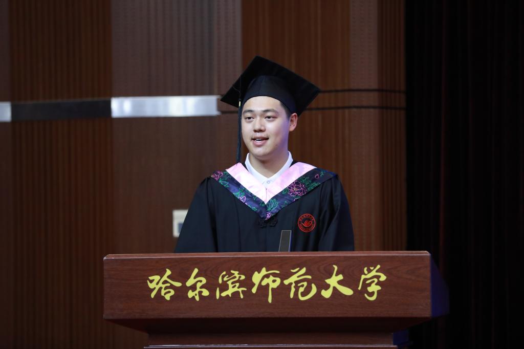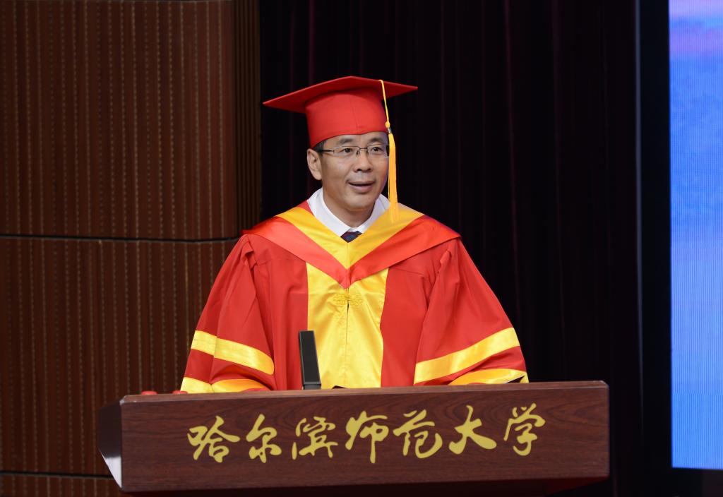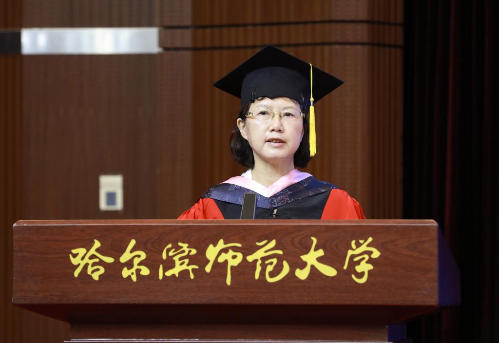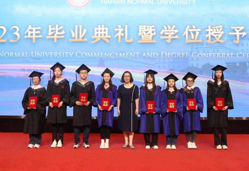 在校生代表、第二十二届校学生会执行主席、地理科学学院2020级本科生兰品宽表达了对学长的不舍与祝福。表示在校生将以学长们为榜样,勤于学习,善于思考,勇于实践,敢于创新,为把母校建设成为国内一流师范大学贡献青春力量。教师代表、第六届黑龙江省高校青年教师教学竞赛文科组一等奖获得者、西语学院副教授于慧莹在发言中深情寄语毕业生,昨天同学们是这里的莘莘学子,明天就要承载起母校的厚望,披荆斩棘,追逐梦想,希望大家在奋斗之时,还能享受人生,保重身体。希望同学们常回母校看看,老师们在哈师大很想你!校友代表、哈尔滨师范大学附属中学校长、国家苏步青奖获得者、中国数学会数学教育分会常务理事、中国数学奥林匹克高级教练员、我校数学系数学教育专业1993届毕业生刘振成分享了自己的成长经历、从事育人工作后的奋斗历程,以及围绕忠心、苦心、诚心、凡心讲述自己的育人感悟。他鼓励同学们,希望大家充满自信,奔向属于自己的未来。伴随着欢快而喜庆的乐曲,党委副书记、工会主席郭砾为2023届优秀毕业生代表颁发荣誉证书;党委常委、副校长尹剑锋为2023年选调应届优秀毕业生到基层工作人员代表颁发纪念奖牌;党委常委、副校长王辉为2023年“大学生志愿服务西部计划”志愿者代表颁发纪念奖杯;党委常委、副校长徐国峰为2023年“助力兴边富民计划”志愿者代表颁发纪念奖杯;党委常委、人事处处长李世彬为2023年“宁齐堃”奖学金获奖代表颁发证书;党委常委、统战部部长张志宏为2023年“田家炳优秀师范生”奖学金获奖代表颁发证书。随后,学校第十一届学位评定委员会主席孙立军教授,学位评定委员会副主席张喜田教授,学位评定委员会委员李庆霞教授、李岗教授、李林教授、徐光教授、孙长良教授,为获得博士、硕士、学士学位的毕业生代表授予学位、拨流苏,为毕业学子送上最深切的祝福。全场报以热烈的掌声。马明在总结时指出,一朝师大人,一生师大情!母校永远是同学们的温暖港湾、永远是同学们的坚强后盾、永远是同学们的精神家园!同学们也永远是母校和老师们的牵挂。欢迎同学们常回家看看!最后,现场师生齐声高唱《哈尔滨师范大学校歌》,2023年毕业典礼暨学位授予仪式在歌声中落下帷幕。