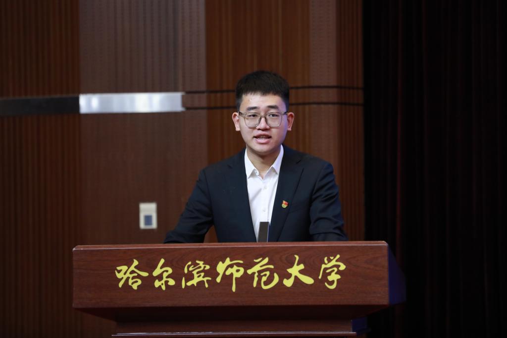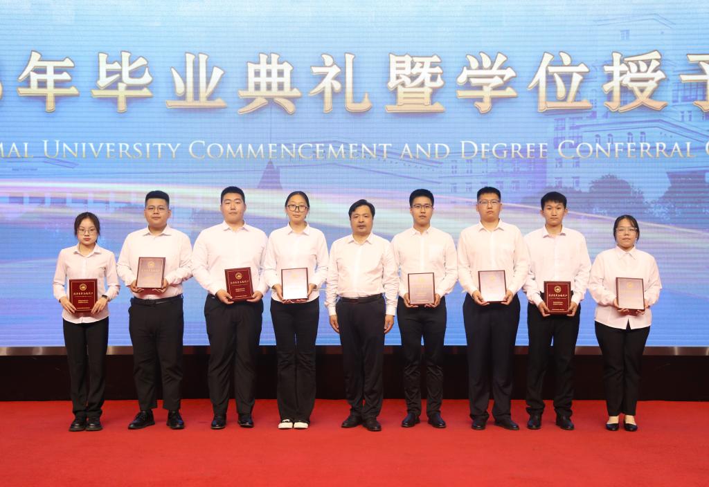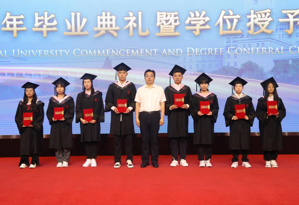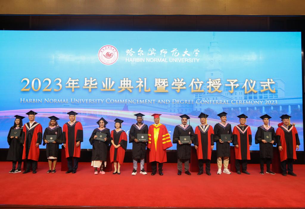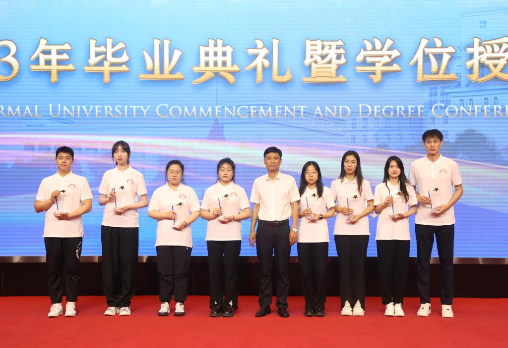 在校生代表、第二十二届校学生会执行主席、地理科学学院2020级本科生兰品宽表达了对学长的不舍与祝福。表示在校生将以学长们为榜样,勤于学习,善于思考,勇于实践,敢于创新,为把母校建设成为国内一流师范大学贡献青春力量。教师代表、第六届黑龙江省高校青年教师教学竞赛文科组一等奖获得者、西语学院副教授于慧莹在发言中深情寄语毕业生,昨天同学们是这里的莘莘学子,明天就要承载起母校的厚望,披荆斩棘,追逐梦想,希望大家在奋斗之时,还能享受人生,保重身体。希望同学们常回母校看看,老师们在哈师大很想你!校友代表、哈尔滨师范大学附属中学校长、国家苏步青奖获得者、中国数学会数学教育分会常务理事、中国数学奥林匹克高级教练员、我校数学系数学教育专业1993届毕业生刘振成分享了自己的成长经历、从事育人工作后的奋斗历程,以及围绕忠心、苦心、诚心、凡心讲述自己的育人感悟。他鼓励同学们,希望大家充满自信,奔向属于自己的未来。伴随着欢快而喜庆的乐曲,党委副书记、工会主席郭砾为2023届优秀毕业生代表颁发荣誉证书;党委常委、副校长尹剑锋为2023年选调应届优秀毕业生到基层工作人员代表颁发纪念奖牌;党委常委、副校长王辉为2023年“大学生志愿服务西部计划”志愿者代表颁发纪念奖杯;党委常委、副校长徐国峰为2023年“助力兴边富民计划”志愿者代表颁发纪念奖杯;党委常委、人事处处长李世彬为2023年“宁齐堃”奖学金获奖代表颁发证书;党委常委、统战部部长张志宏为2023年“田家炳优秀师范生”奖学金获奖代表颁发证书。随后,学校第十一届学位评定委员会主席孙立军教授,学位评定委员会副主席张喜田教授,学位评定委员会委员李庆霞教授、李岗教授、李林教授、徐光教授、孙长良教授,为获得博士、硕士、学士学位的毕业生代表授予学位、拨流苏,为毕业学子送上最深切的祝福。全场报以热烈的掌声。马明在总结时指出,一朝师大人,一生师大情!母校永远是同学们的温暖港湾、永远是同学们的坚强后盾、永远是同学们的精神家园!同学们也永远是母校和老师们的牵挂。欢迎同学们常回家看看!最后,现场师生齐声高唱《哈尔滨师范大学校歌》,2023年毕业典礼暨学位授予仪式在歌声中落下帷幕。