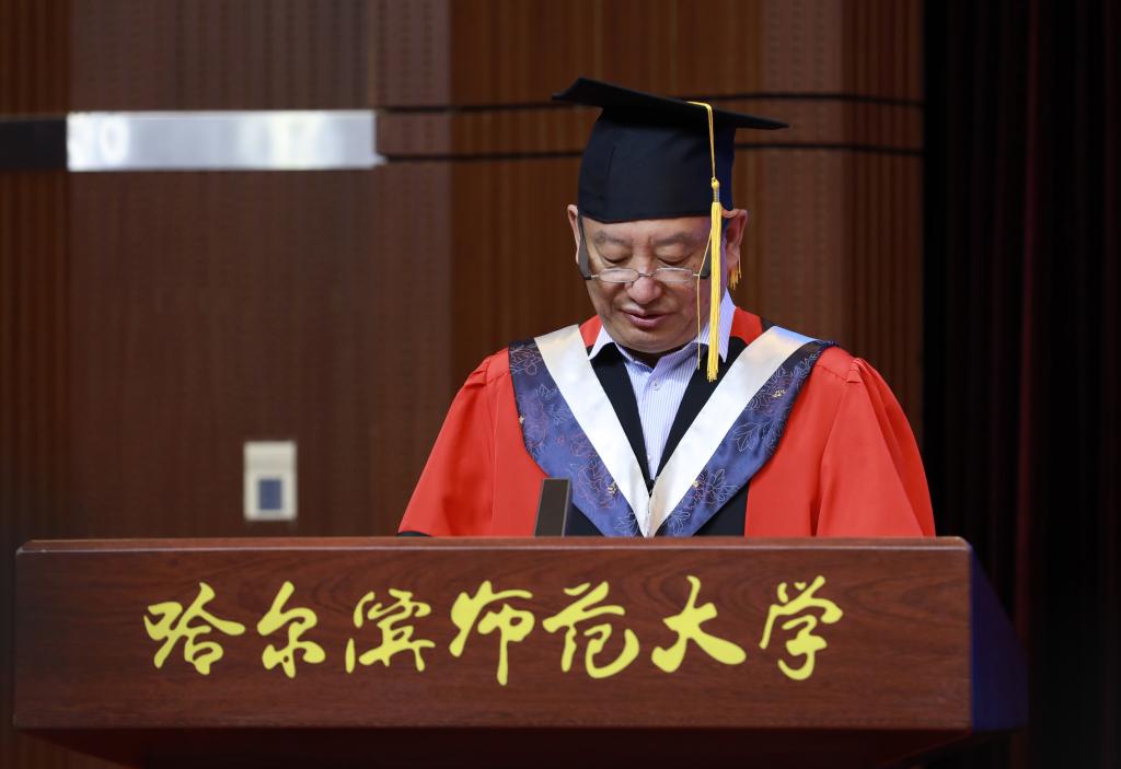 在庄严的国歌声中,毕业典礼暨学位授予仪式拉开帷幕。校学位评定委员会副主席、党委常委、副校长、博士研究生导师张喜田教授宣读了获得博士、硕士、学士学位的2023届毕业生名单和优秀毕业生名单;校学位评定委员会委员、党委副书记、博士研究生导师李庆霞教授宣读了2023年选调应届优秀毕业生到基层工作人员,“宁齐堃”奖学金、“田家炳优秀师范生”奖学金获得者名单;党委常委、纪委书记、省监委驻哈尔滨师范大学监察专员姜国庆宣读了“大学生志愿服务西部计划”和“助力兴边富民计划”志愿者名单。